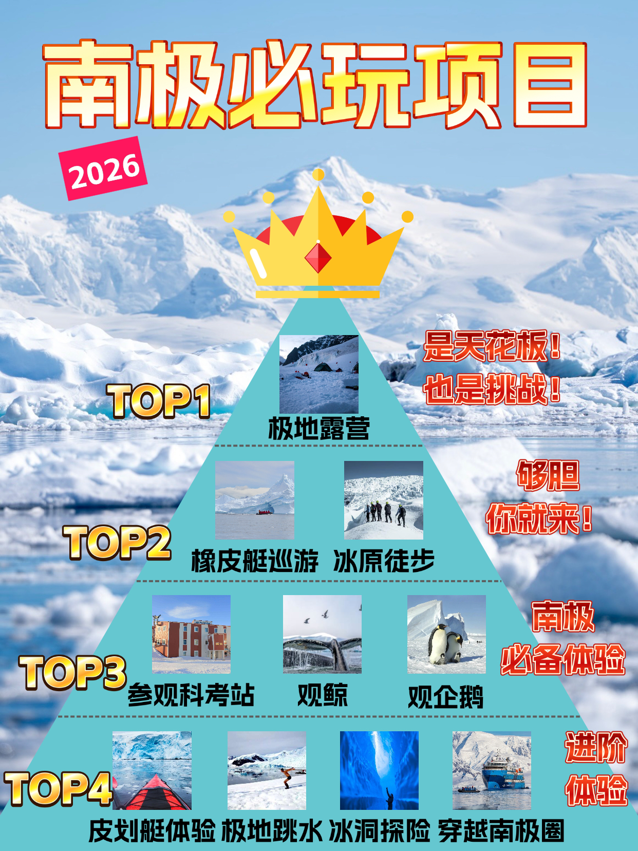 宝子们!谁能想到有生之年能把南极提上日程✨!整理了2026南极必玩项目,从入门体验到终极挑战,每一个都戳中我的心巴,快码住📝!