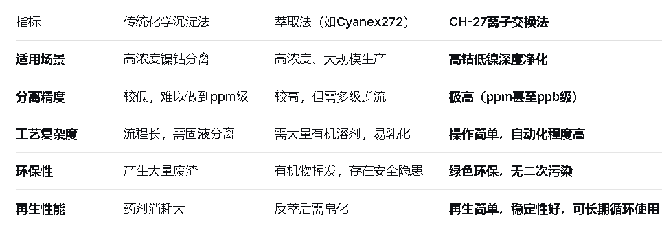 传统方法如化学沉淀法,不仅容易造成钴的损失,且对于低浓度的镍往往“束手无策”。于是,离子交换法凭借其高选择性、深度净化、环保的优势,逐渐走到了台前 。