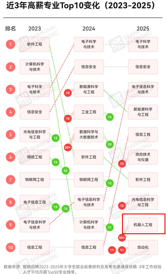 而从行业薪资来看,机器人工程专业正迎来爆发式增长。智联招聘的数据显示,该专业从2023年的50名开外,一路飙升至2025年的第9名,首次跻身高薪Top10。足以见得“机器人+”时代的到来,人形机器人、工业机器人、医疗机器人从概念走向商用,掌握核心技术的人才,自然会成为市场争抢的香饽饽。