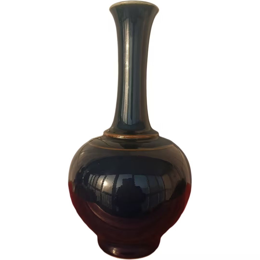 这件瓷瓶的天球瓶特征极为标准:长颈挺拔修长,溜肩圆润过渡,圆腹饱满如球,圈足内敛规整 —— 这种 “上细下丰” 的比例,既符合 “天圆地方” 的传统哲学,又展现出皇家器物的庄重气度。据《清宫造办处活计档》记载,康熙二十三年(1684 年),御窑厂曾奉命烧制 “霁蓝釉天球瓶二十件”,专供养心殿与乾清宫陈设,足见其在皇家器物中的地位。