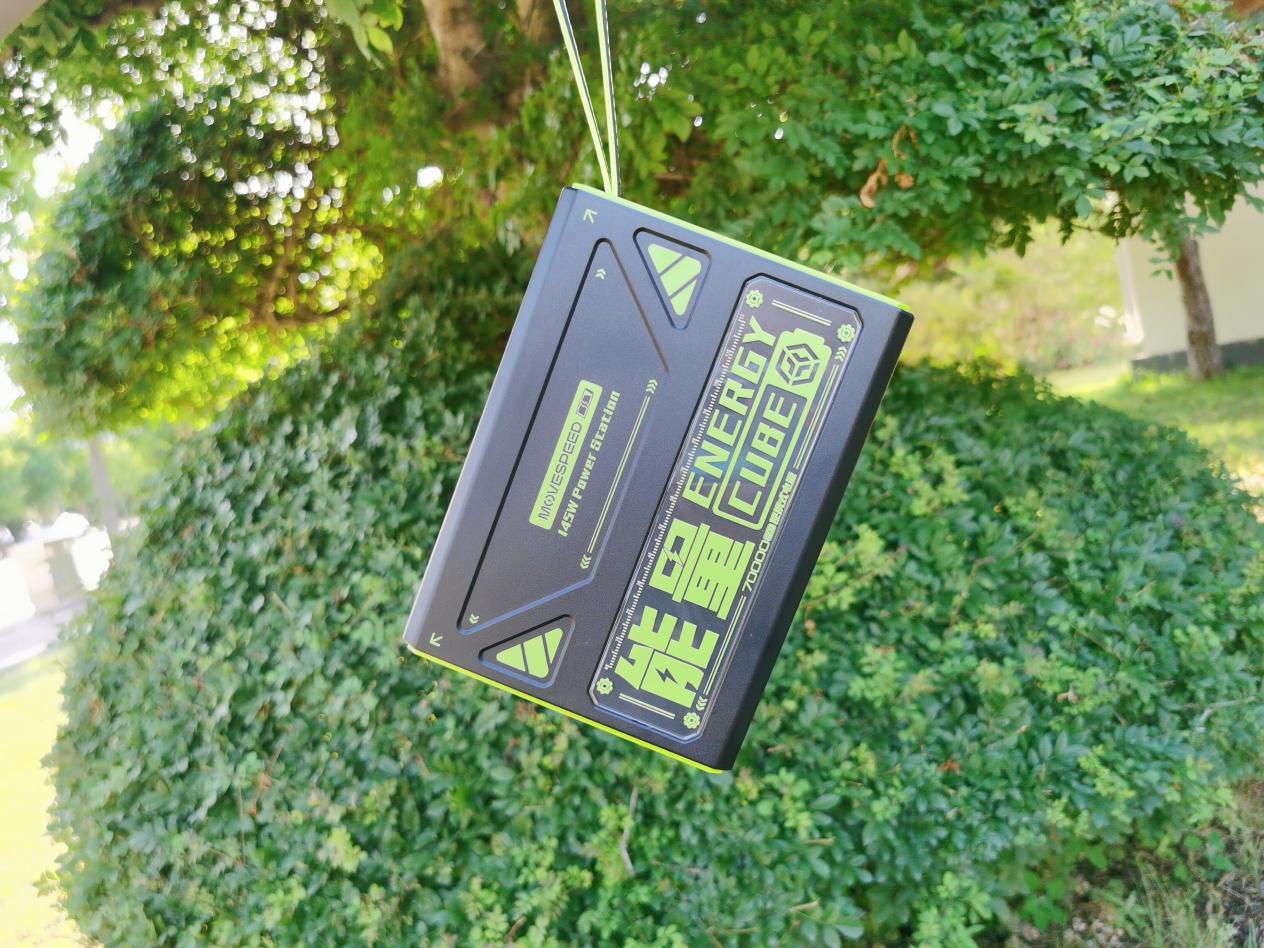 第一次拿到移速能量魔方Pro Max,第一反应是 “扎实”——机身比普通充电宝大一圈,1.3kg的重量拿在手里很有存在感,不过自带的挂绳设计很贴心,单手提携非常的方便。黑绿配色透着大自然的时尚感,机身采用防刮耐磨的ABS材质,摸起来有点磨砂质感,在户外磕磕碰碰也不怕留痕迹。