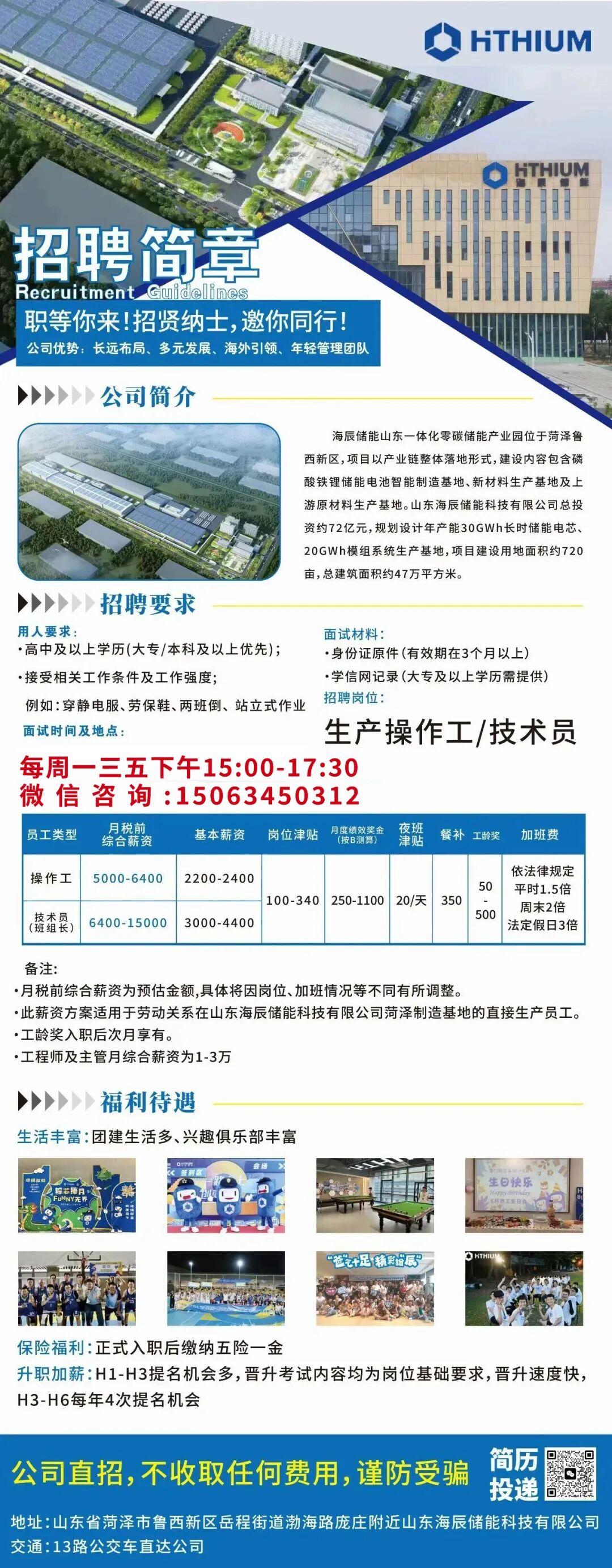 本次招聘主要面向生产操作工和技术员,要求应聘者具备高中及以上学历(大专或本科优先)。海辰储能山东一体化零碳储能产业园位于菏泽鲁西新区,项目以产业链整体落地形式,建设内容包含磷酸铁锂储能电池智能制造基地、新材料生产基地及上游原材料生产基地。