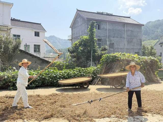 当然,自然脱粒的等待是漫长的,加上好天气也不是天天有,所以大家就想办法让黄豆脱粒。把黄豆禾平铺到地面上,待豆荚变干燥变脆,大家找来连枷,你一下我一下,啪啪啪……这项农活看似简单,实则讲将技巧。打连枷要双腿微屈,站稳后靠腰力和腕力发力,让边枷头在空中划出完整的圆弧,才能既省力又有效的拍打。这种两人对站,此起彼落地交替击打,形成富有节奏的劳动场景。