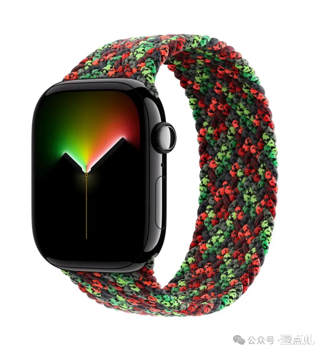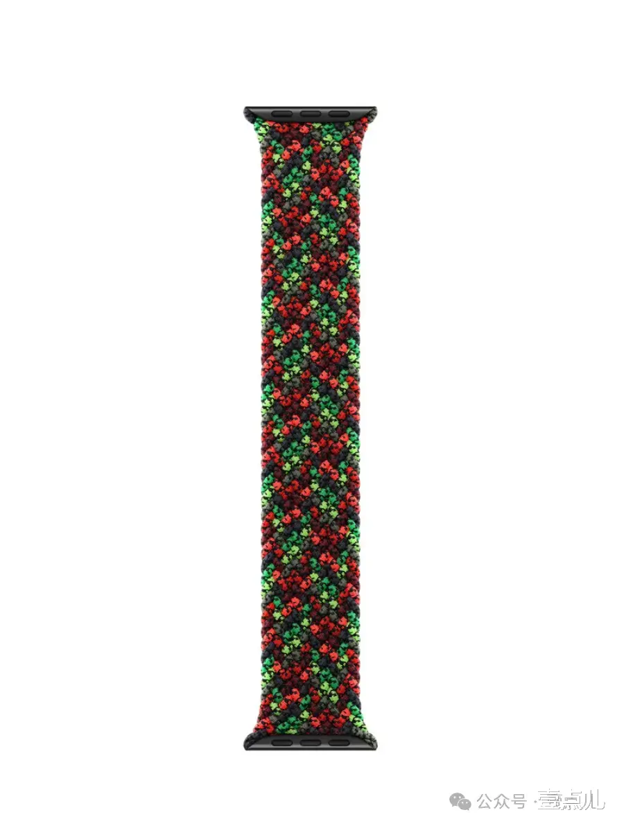 Black Unity(黑色团结)编织单圈表带是专为纪念黑人历史设计的。该表带延续了苹果团结系列的设计理念。由苹果黑人创意团队和合作伙伴共同设计。将再生聚酯纱长丝缠绕超细硅胶丝织造而成。呈现出深浅不一的红、绿、黑三色分层效果。图片看着有点像花棉袄的感觉。