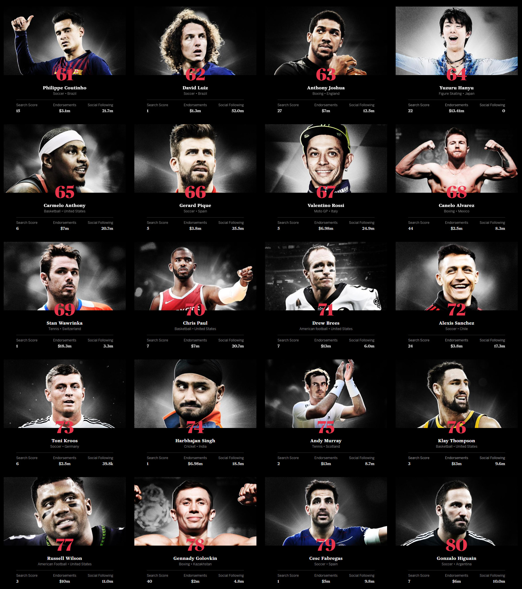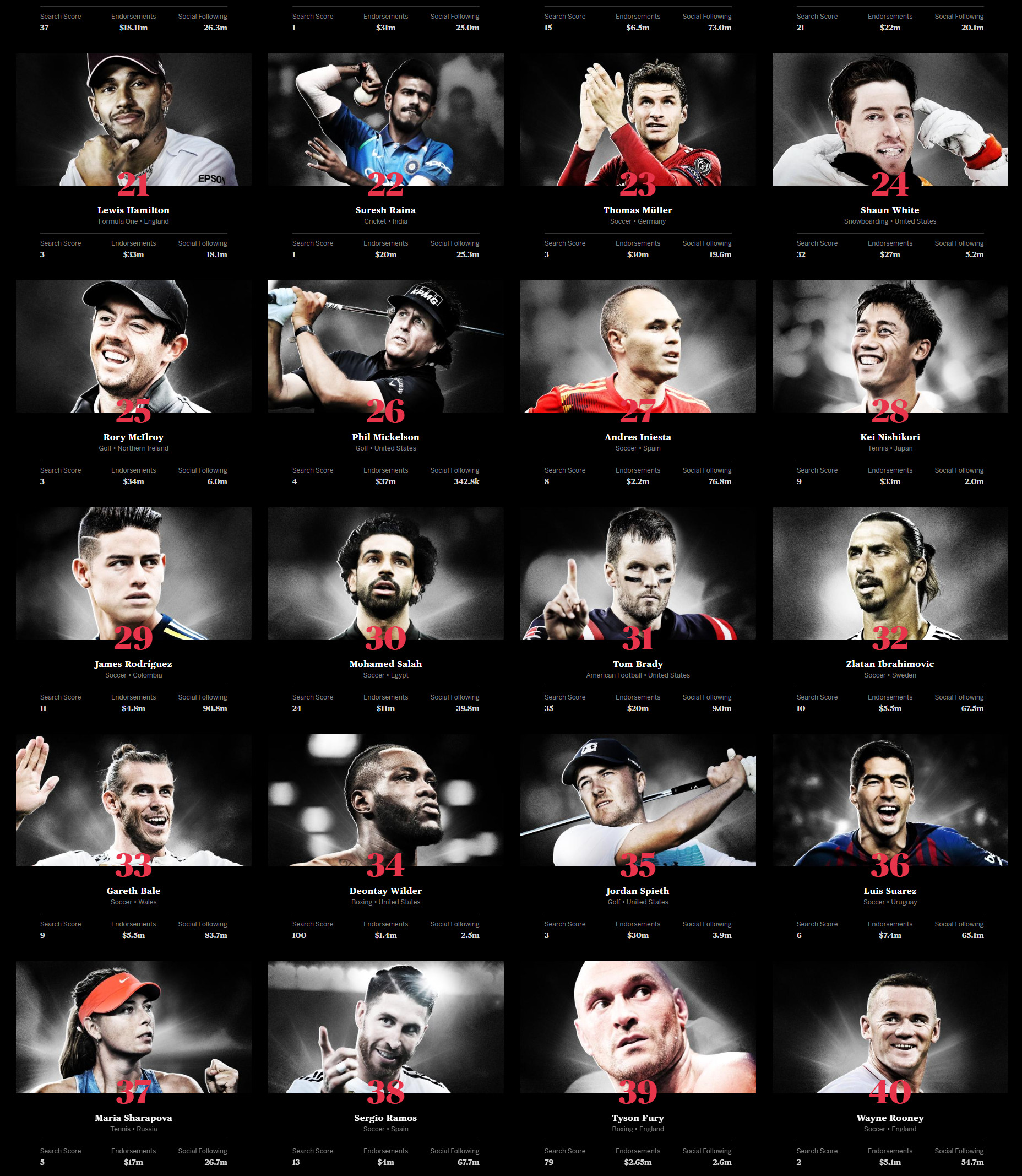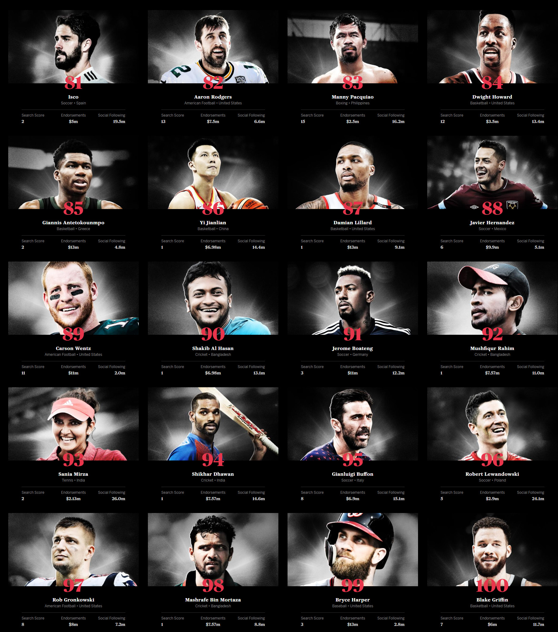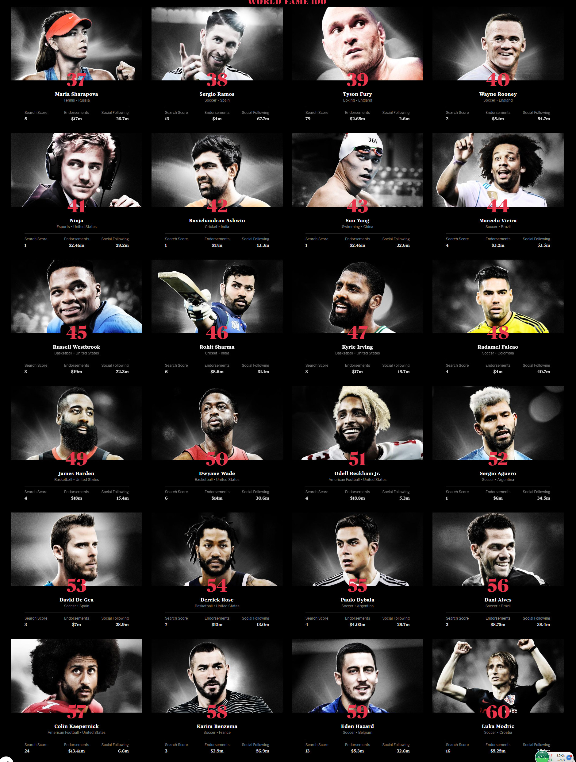 ESPN评选出了2019年度世界前100位知名体育运动员,其中,罗纳尔多以绝对的优势位居世界第一位;而在篮球方面一共有18位球星入选,其中詹姆斯位居第二;库里排在第九;杜兰特正好没进前十;中国男篮易建联位列第86位,无愧国内第一人;格里芬正好入围了前100位。本次排名,ESPN综合了运动员的薪金状况、商业代言、网络社交媒体的受关注程度、以及被检索的数量等综合指标得出。 以下是具体的100位名单单,截图来自ESPN的活动官网: #中国男篮# #CBA# #NBA# #NBA季后赛# #足球# #体育# #我要上头条# #网球# #板球# #橄榄球# #棒球# #拳击#