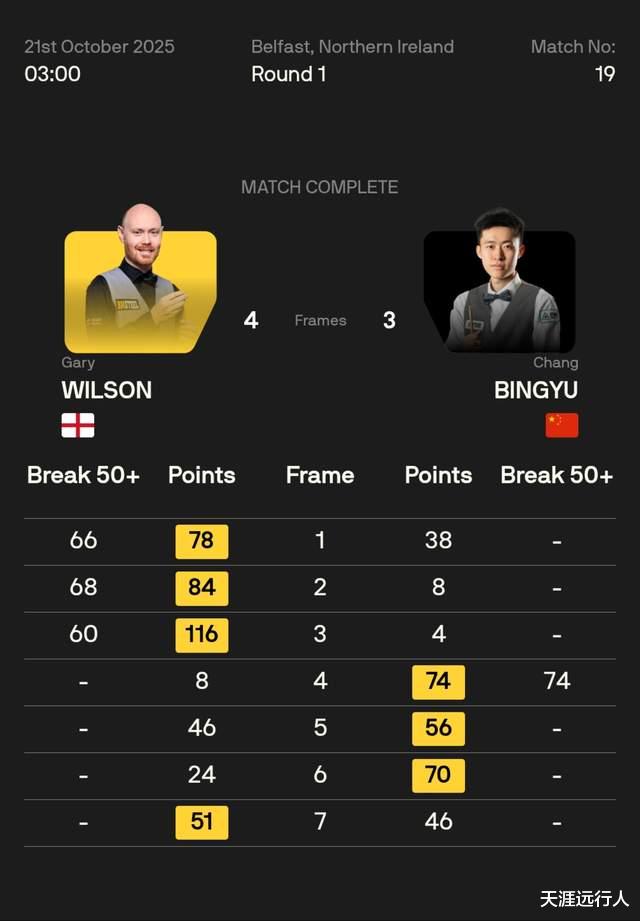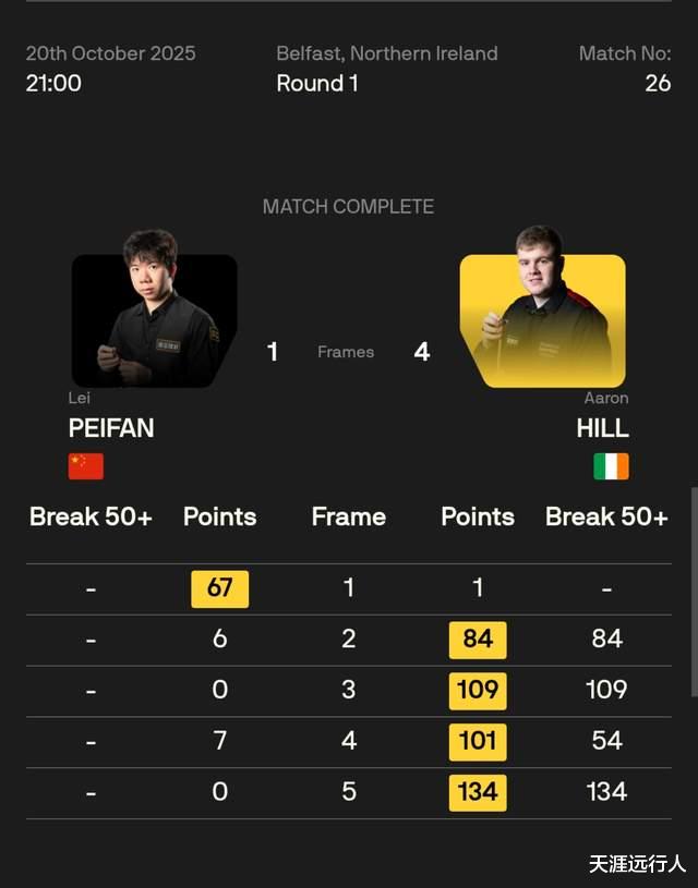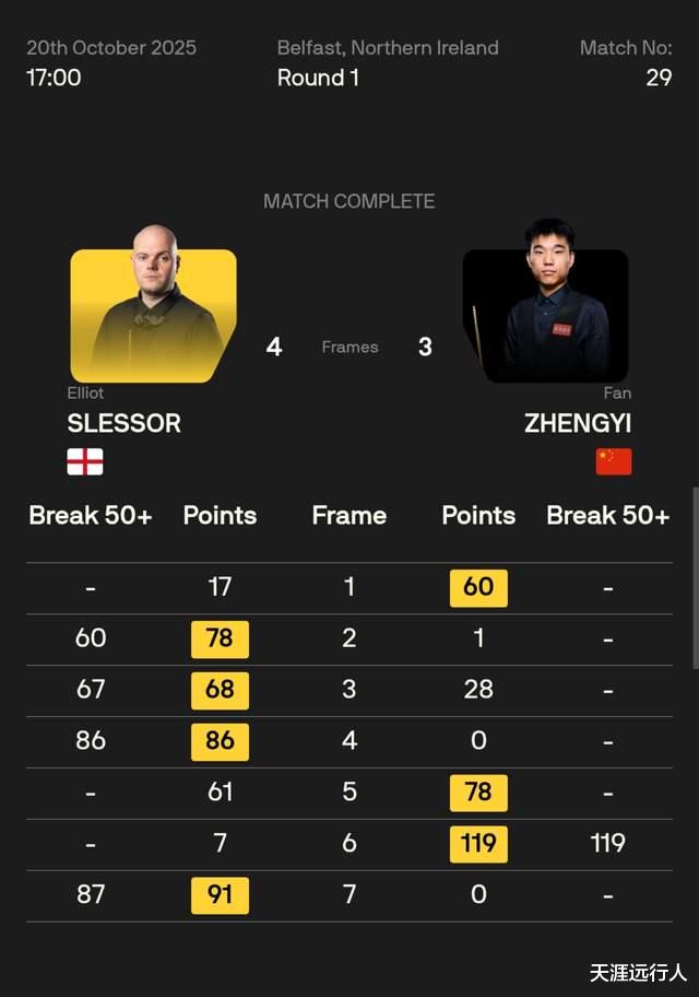 另外的三场,两位零零后小将之争,身为正赛种子的苏格兰公开赛卫冕冠军中国球员雷佩凡3-4不敌爱尔兰亚伦·希尔,中国军团零零后小将厚度的优势,渐渐被侵蚀;排名赛一冠头衔拥有者范争一3-4不敌埃利奥特·斯莱塞,本赛季重回职业的常冰玉,战至决胜局,输掉最后一颗黑球,殊为可惜。