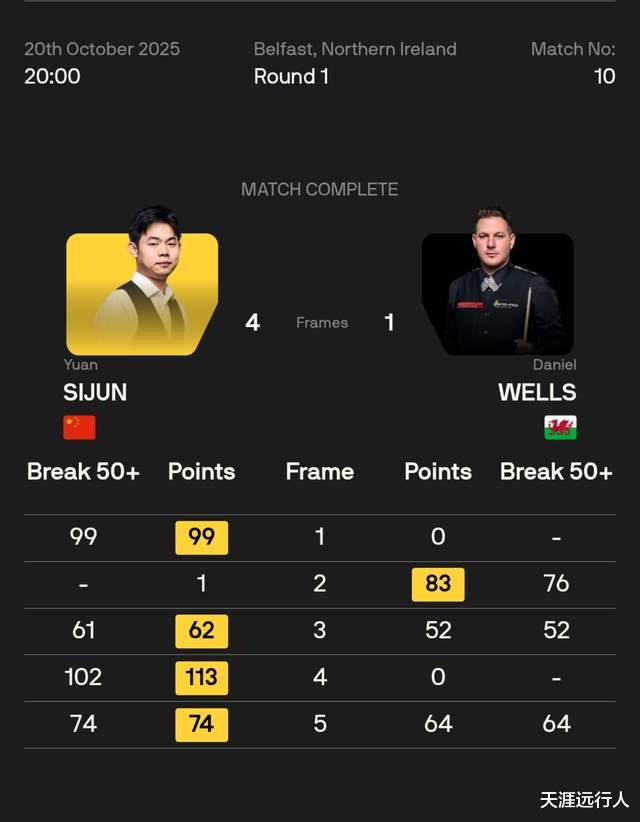致胜的第五局,小袁单杆74分强势绝杀打了单杆64分的威尔士球员威尔斯。