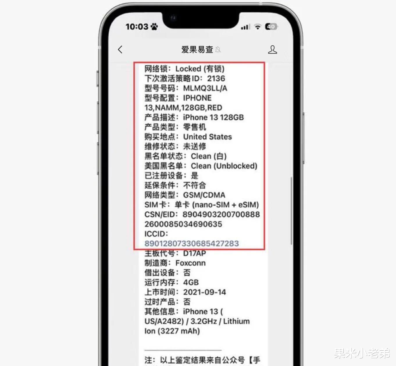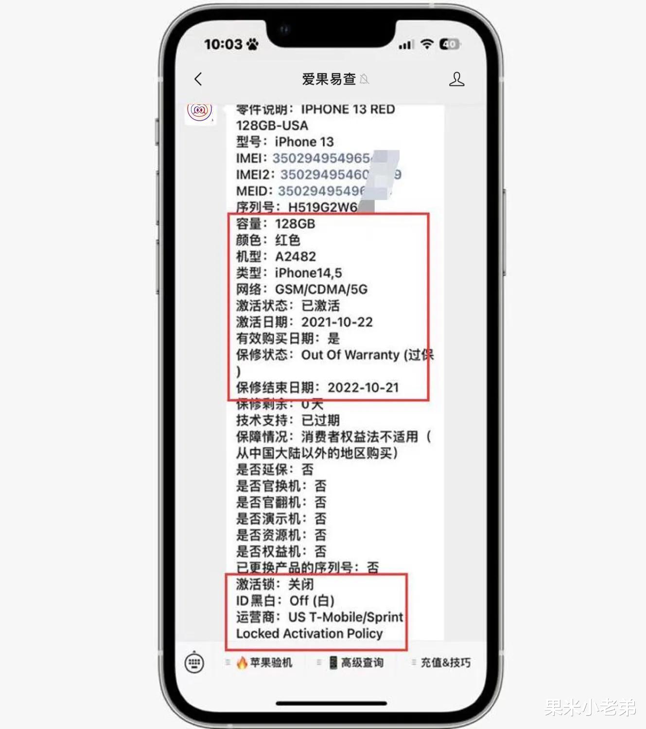 从截图可以看到,该机是128GB、红色,激活日期是2021年10月份,到现在已使用一年时间,激活锁关闭,无隐藏ID。ID黑白:“白”,不是丢失/被盗机。是有锁机。