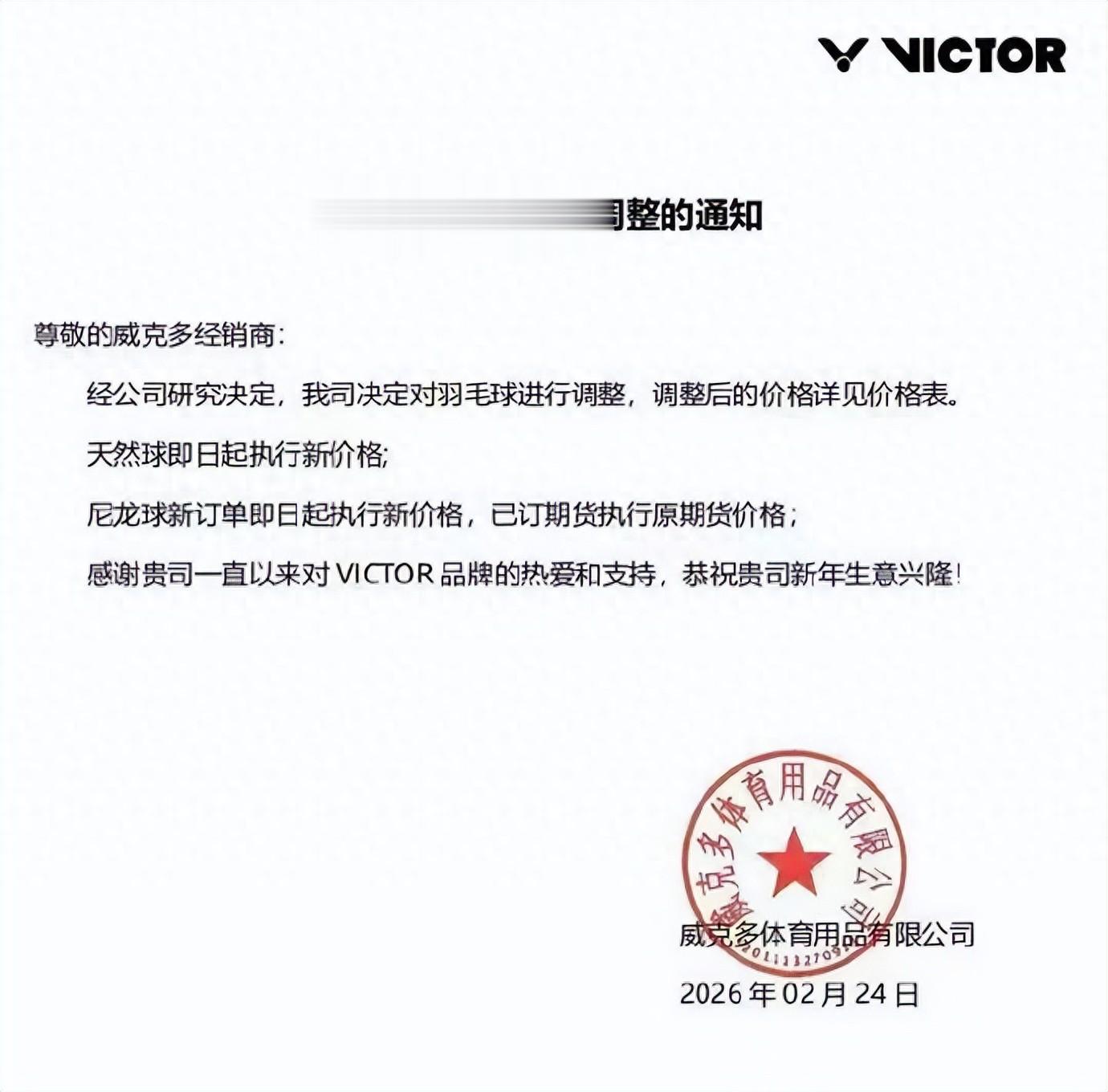 自2026年2月下旬起,头部羽毛球品牌率先启动调价,威克多于2月24日率先发布官方降价通知,对旗下天然羽毛球、尼龙球等核心产品执行全新供货价,迅速引发行业连锁反应;随后亚狮龙、齐克努、超牌等主流品牌纷纷跟进,陆续发布降价公告,形成规模化、行业性的降价态势,本轮降价自3月1日起陆续在全国线下门店、各大线上电商平台落地执行。