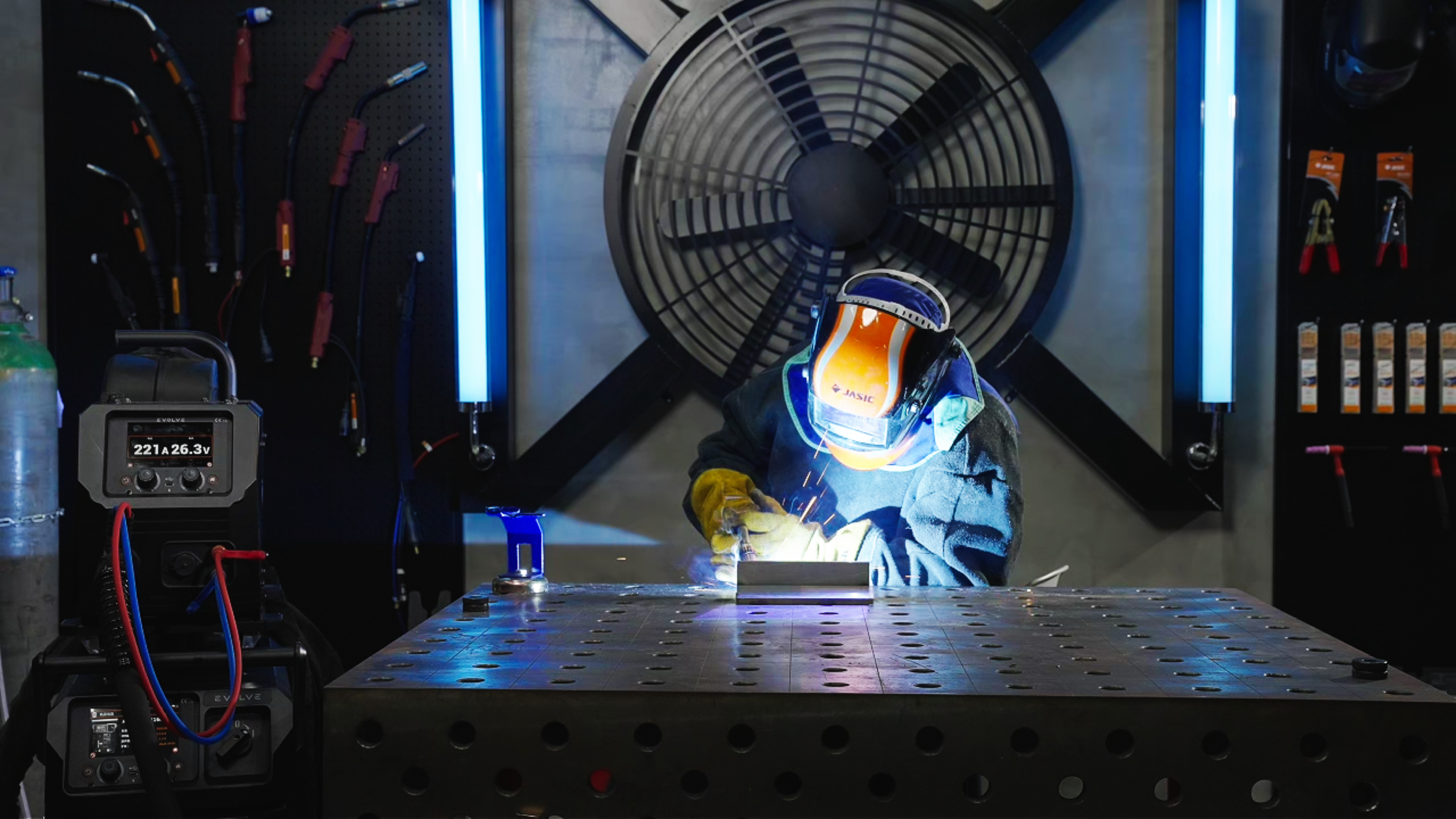 负责焊接的技师托马斯用的是佳士evolve系列焊机。机身通体黑色,控制面板简洁,显示屏上清晰显示着当前的焊接参数:单脉冲模式,基值电流90A,峰值电流210A,脉冲频率2.8Hz,占空比45%。他花了大约五分钟根据板材厚度调好了参数,然后在试板上验证了几道焊缝,确认熔深和成型都满意后开始正式焊接。