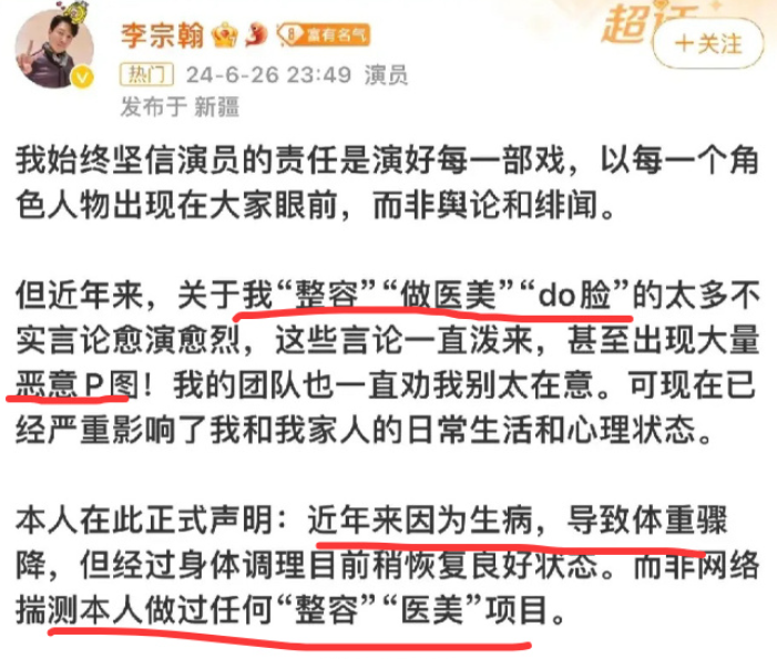在2024年他就在社交平台辟谣自己动脸了,只是因为生命导致五官有变化。