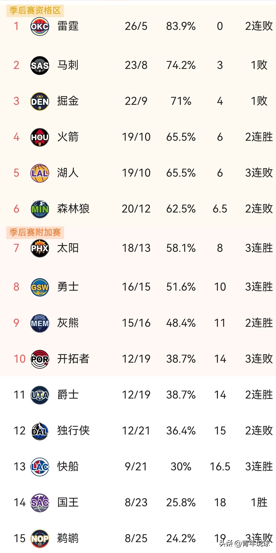 西部最新排名如上图,较上一日具体变化为:火箭队升至第4位,湖人队跌至第5位,爵士队升至第11位,独行侠队跌至第12位,国王队升至第14位,鹈鹕队跌至第15位。