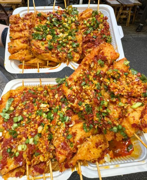 卤好的干子捞出来,控干水分,下油锅炸。油温七成热,干子下锅后迅速膨胀,花刀张开,像一朵朵金色的花。炸到表面硬脆,捞出控油,趁热刷上辣椒油和芝麻酱,撒上孜然粉和葱花。咬一口,外壳酥脆,里面还是嫩的,卤水的咸香和辣椒的香辣在嘴里扩散,花刀的缝隙里藏着的酱汁会爆出来,非常过瘾。