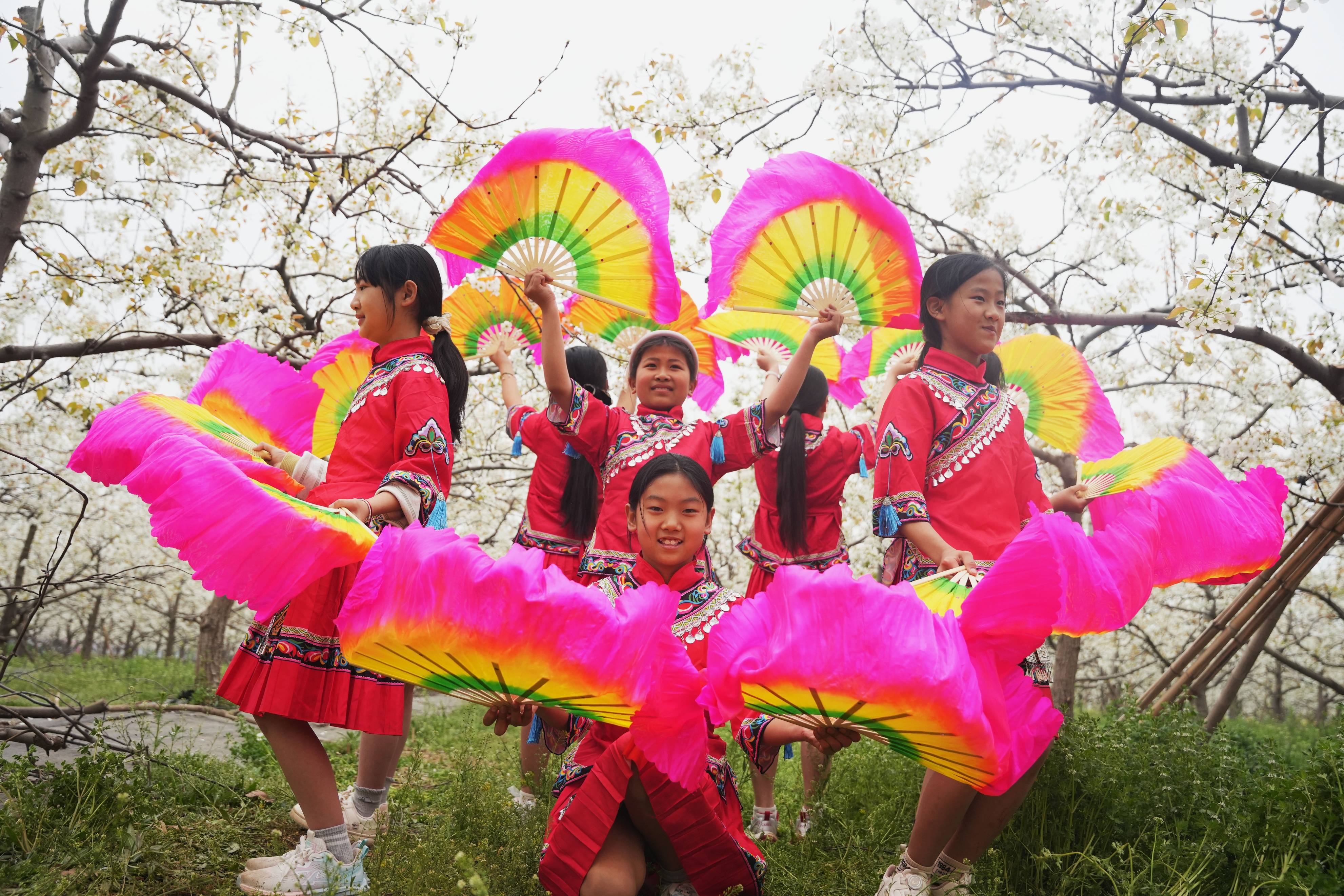 共工社4月9日电(苏广志 潘志方 郭泽鑫)4月8日,河北省隆尧县牛家桥乡北杨家楼村香梨基地,牛家桥小学的师生踏青赏花、作画写生、习武健身,洁白的梨花,学生们娇艳的服装和剪影,构成一幅幅美丽的图画。