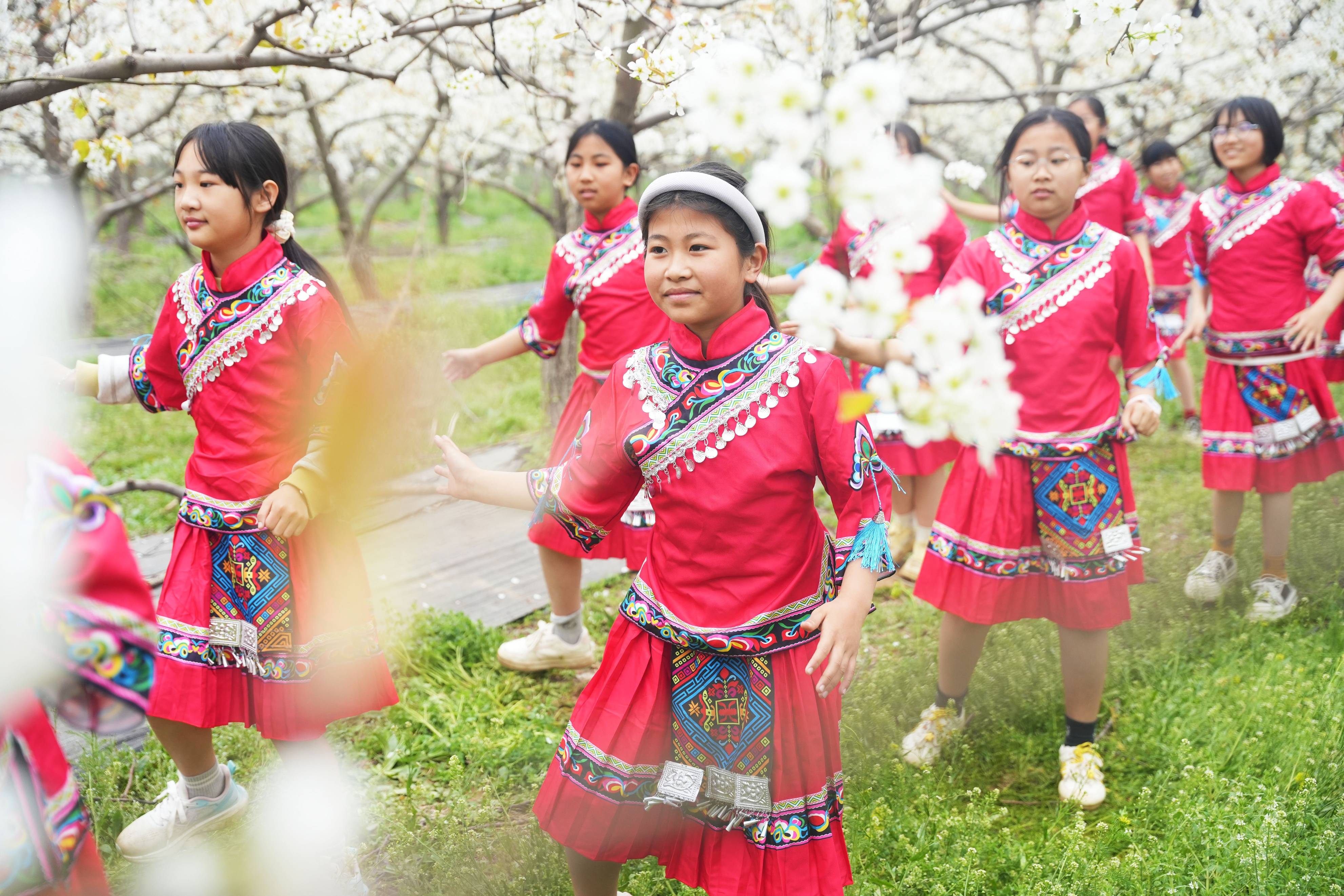 听完赵树敏的讲解,同学们开始分组活动,各个兴趣小区围拢在一起,准备自己的特色活动。有写作小组、武术小组、美术小组、舞蹈小组等。大家以小组为单位,以梨园为背景,开展兴趣实践探索。写作小组细致观察梨花形态、记录生长特点,现场吟诵咏梨花诗词;美术小组手绘梨花图景,用千姿百态的梨花展现春天的美好;舞蹈小组和武术小组分别找到一处宽阔的地方,研习切磋,美丽的舞姿和矫健的身形在梨花的映衬下,显得格外壮观。还有的学生在林间游玩赏花,在探嫩芽、拾落花的过程中,沉浸式学习梨花知识、体悟梨花高洁的品格,展现出团结协作、认真探索的良好风貌。研学期间,师生、家长纷纷用镜头定格梨花香满园的美好瞬间,留存春日温暖记忆。