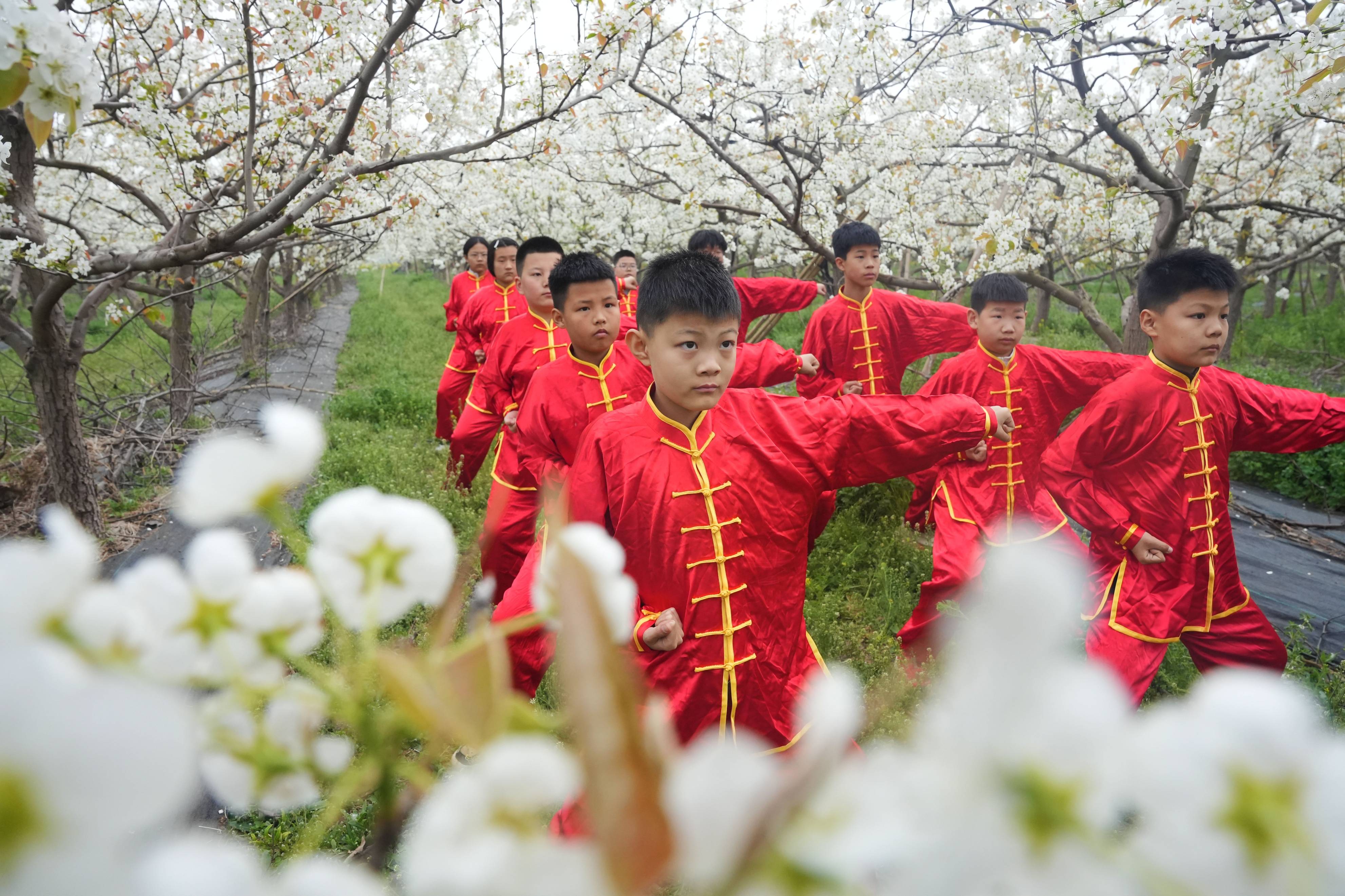 图说:在河北省隆尧县牛家桥乡北杨家楼村香梨基地,牛家桥小学的学生们正在研习武术。共工社 发 (郭泽鑫 摄)