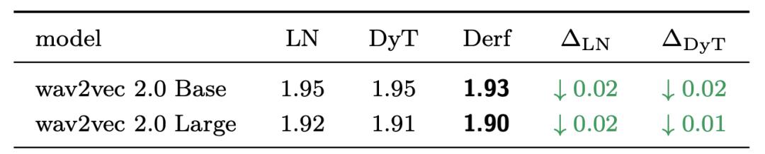 结果显示,Derf 在两个 wav2vec 2.0 模型上均实现了比 LayerNorm 和 DyT 更低的验证损失,表明其语音表示能力更强。