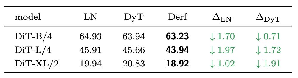 结果显示,Derf 在所有 DiT 模型规模下的 FID 都低于 LayerNorm 和 DyT,进一步验证了其在扩散 Transformer 中的有效性。