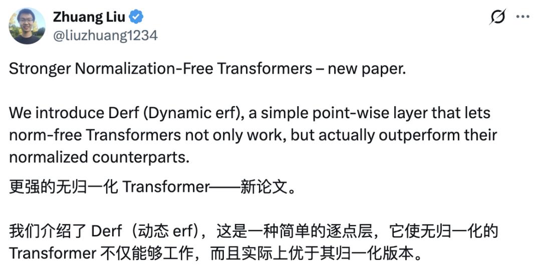 Github 链接:https://github.com/zlab-princeton/Derf 刘壮本人也在 X 账号上分享了这一成果。他表示,这是一篇关于更强无归一化 Transformer 的新论文:研究团队提出了 Derf(Dynamic erf),一种结构极其简单的逐点(point-wise)层。借助 Derf,完全不依赖归一化层的 Transformer 不仅能够稳定训练,而且在实际性能上已经可以超越传统依赖 LayerNorm 等归一化机制的模型。
