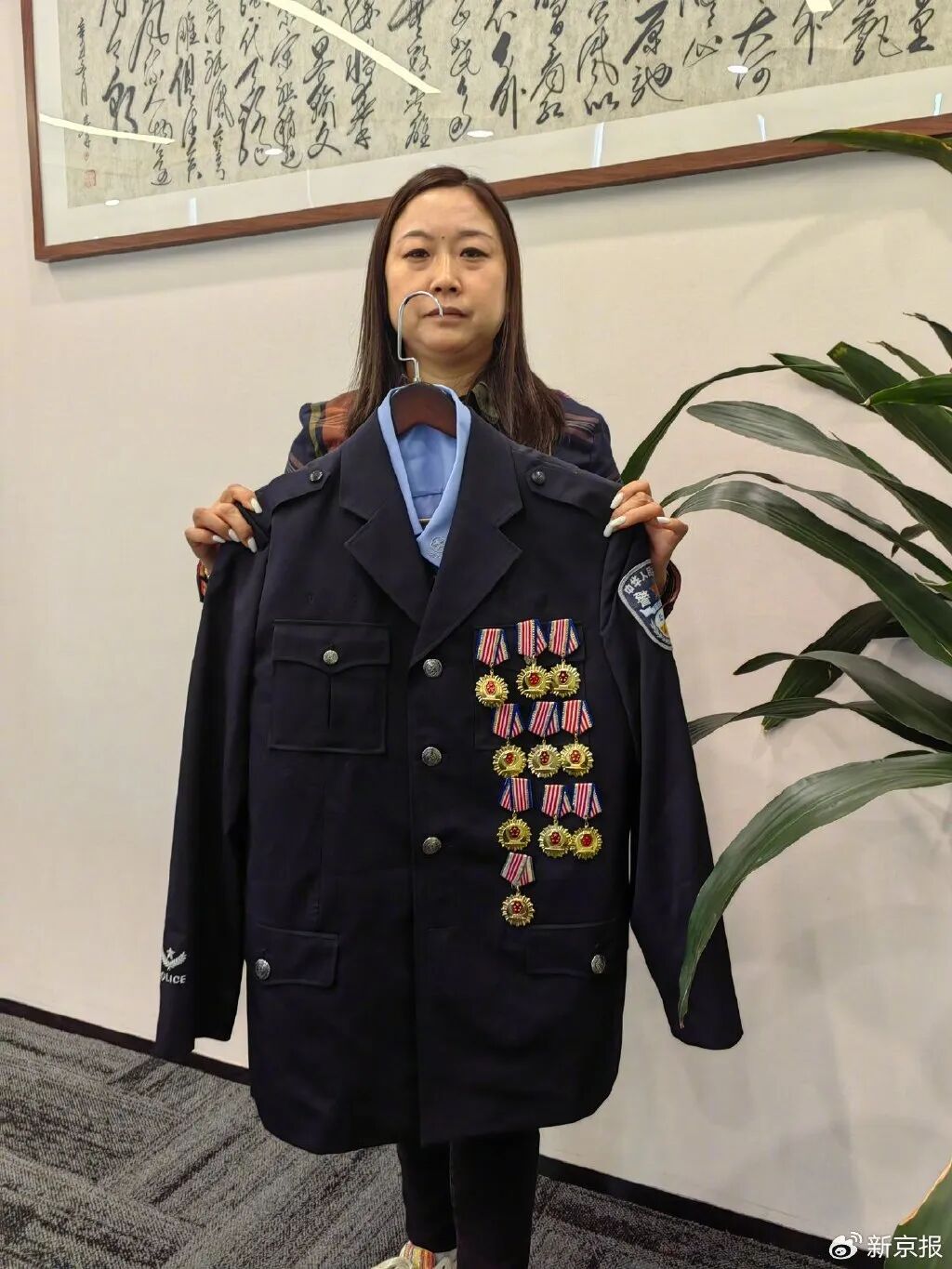 刘威妻子展示刘威的警服和奖章。图源“@新京报