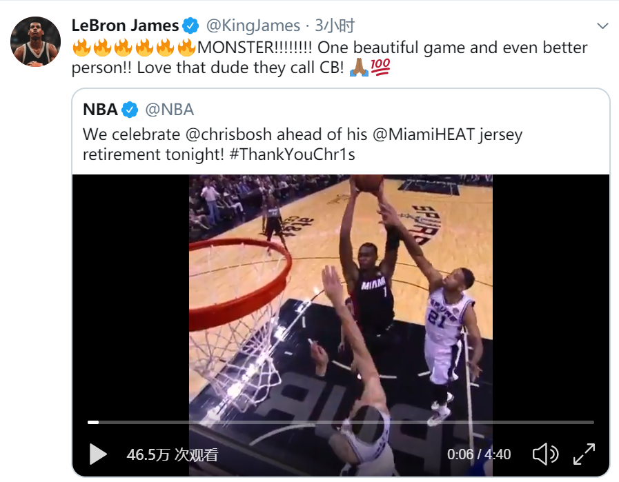 热火对阵魔术的中场时间,波什的球衣正式在迈阿密退役。老詹特地发给波什的祝贺词中提到:恭喜我的兄弟波什,CB,如果没有你,我不可能在迈阿密夺冠。在迈阿密的四年也好,我不在的那些年也罢,你一直是真正的职业球员,他总是忘我的把自己放在其次,以球队为重。我很想去但却不能到场目送1号球衣升空,但我的爱不会缺席,我也会看直播、转发。此外,老詹还特地发推力挺波什。