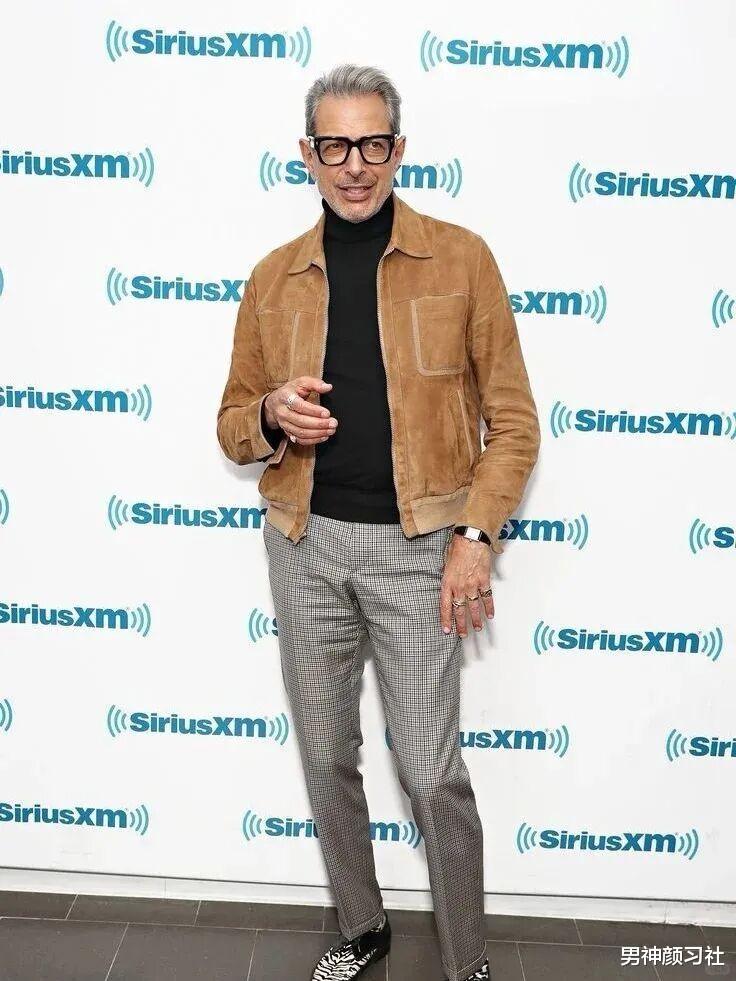 麂皮夹克 + 黑色高领衫 + 西装裤这种穿法走的是极简老钱风,全身颜色控制在两个以内,利用皮革的自然光泽提升整身造型的价位。