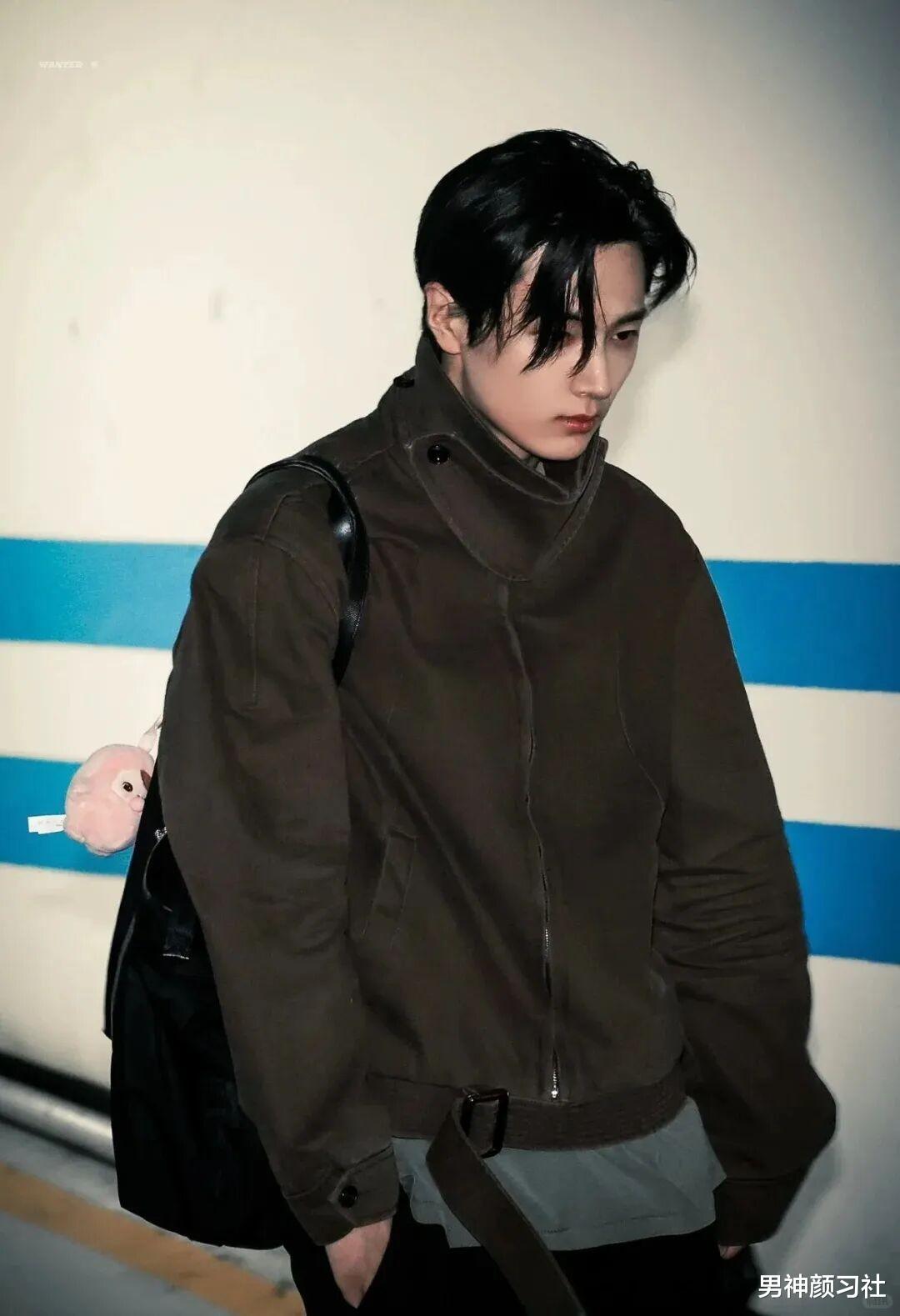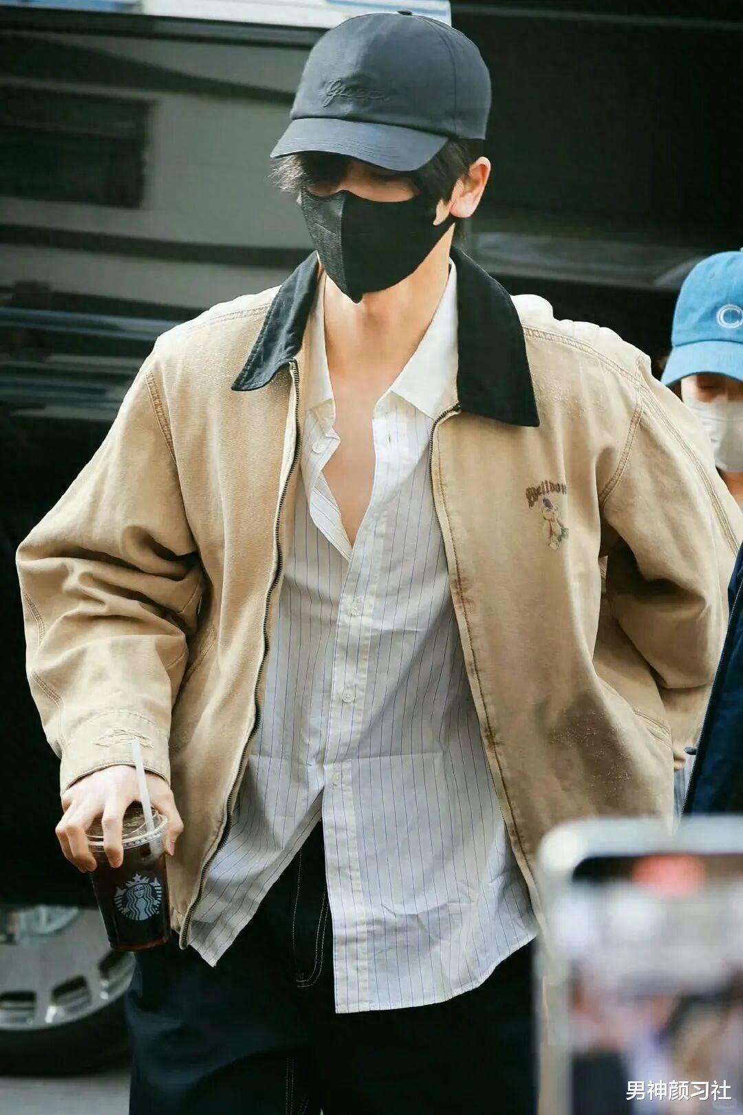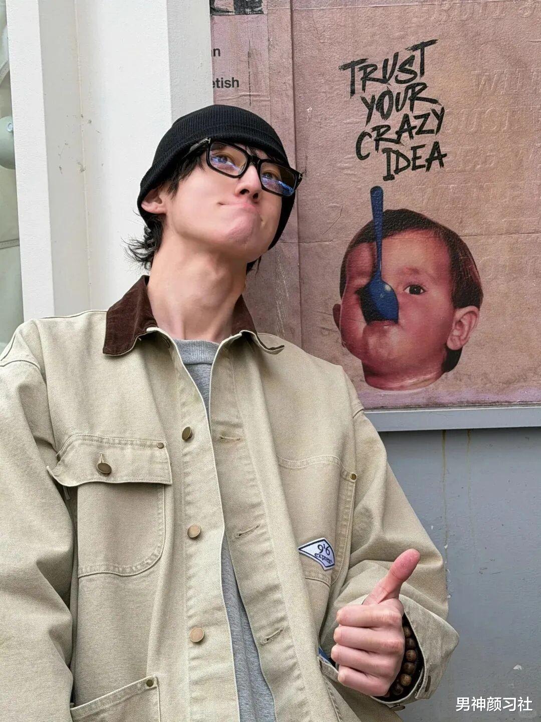 工装夹克 + 针织衫 + 牛仔裤,尤其是衣服的颜色有色差的,一深一线能增加颈部的层次感,打破工装的沉闷。陈飞宇的这套就特别吸睛,走在路上准保很多人看你。