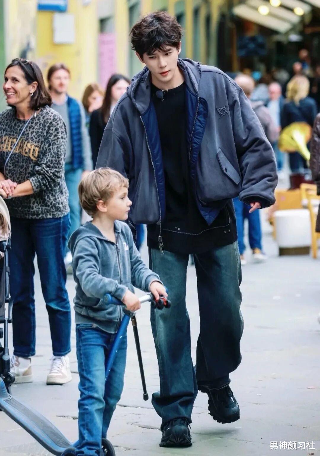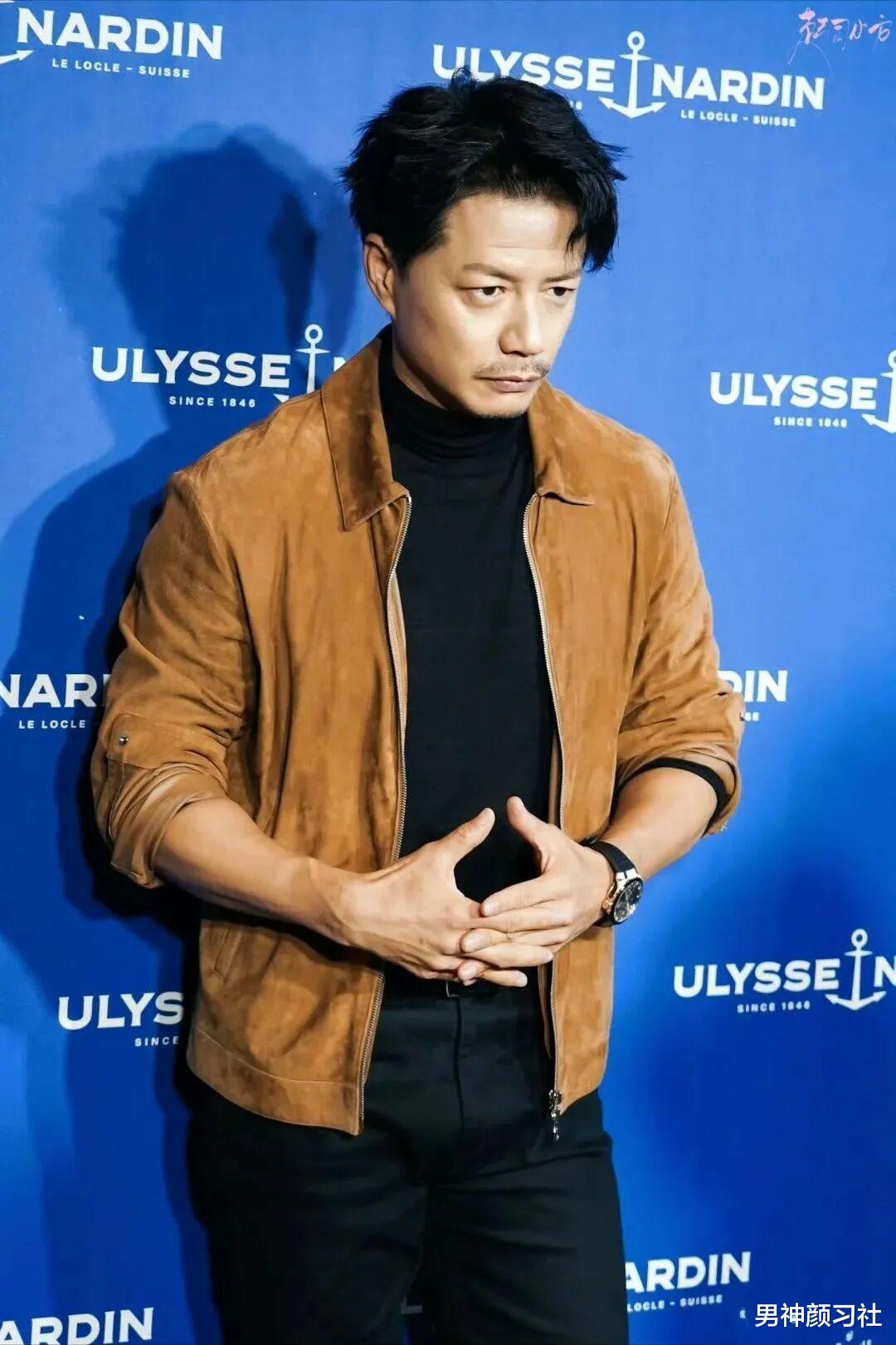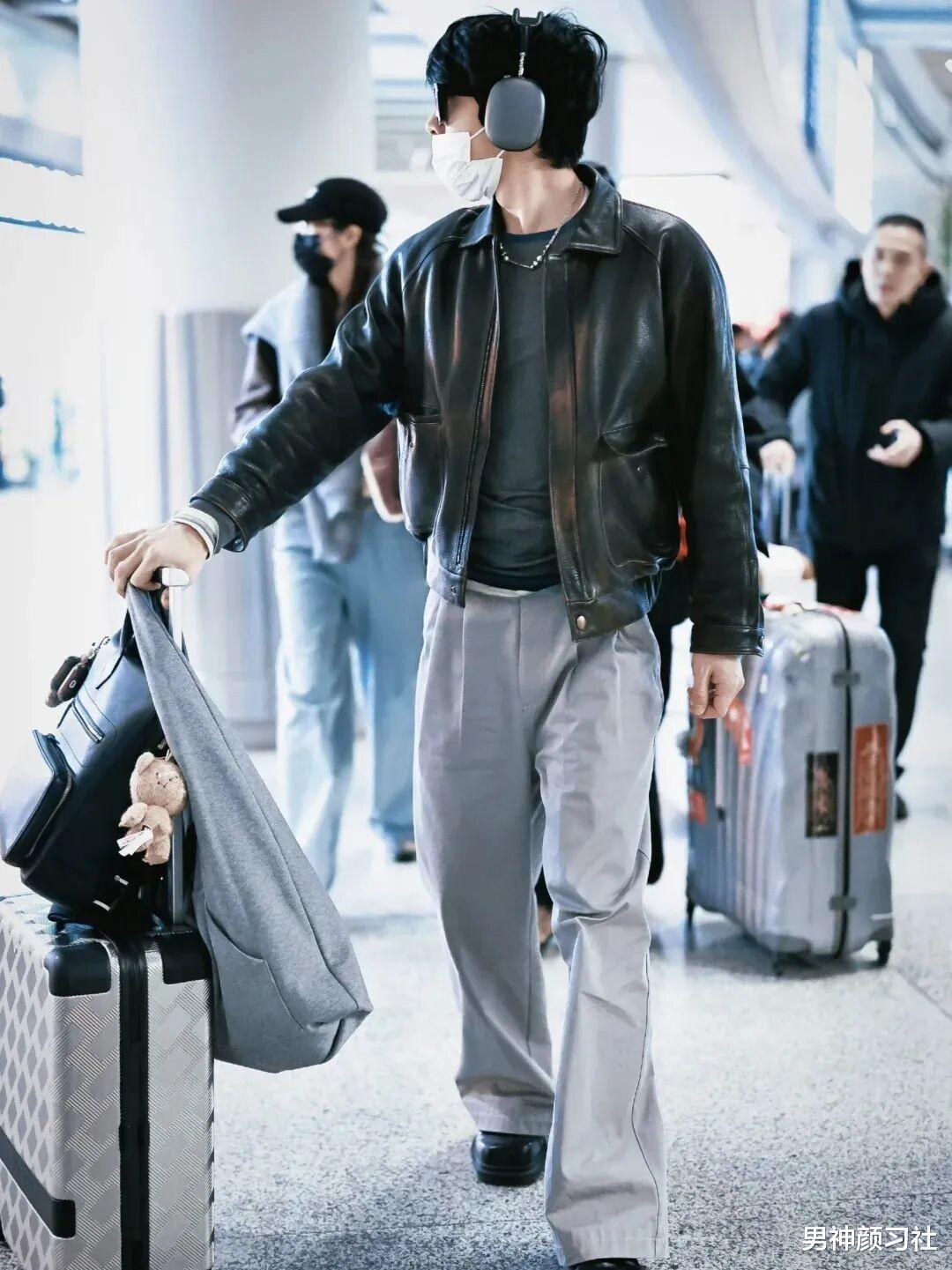 工装夹克 + 针织衫 + 牛仔裤,尤其是衣服的颜色有色差的,一深一线能增加颈部的层次感,打破工装的沉闷。陈飞宇的这套就特别吸睛,走在路上准保很多人看你。