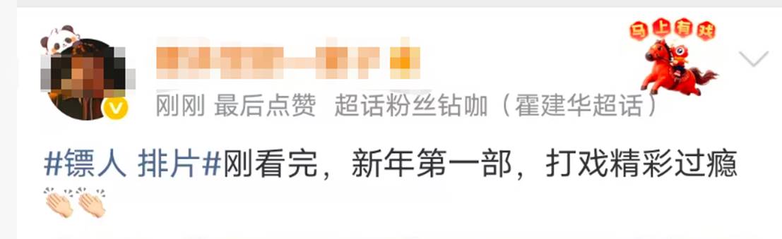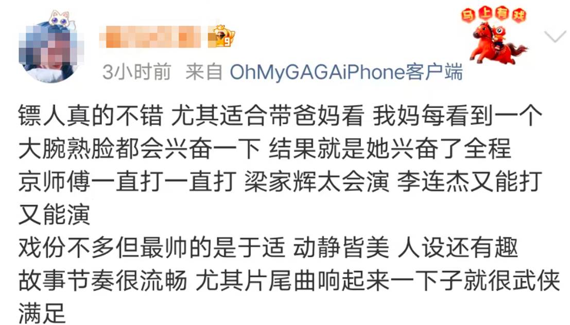 也正因为这样,《镖人》才真正做到了全家通吃。老一辈看的是熟脸与情怀,武侠是他们青春里最辉煌的题材,看着眼熟、演得亲切,代入感拉满;我们这代人看的是高能打戏、颜值与名场面,爽感十足;小朋友圆了武侠梦,策马江湖、高手对决,热闹又热血,全程坐得住。