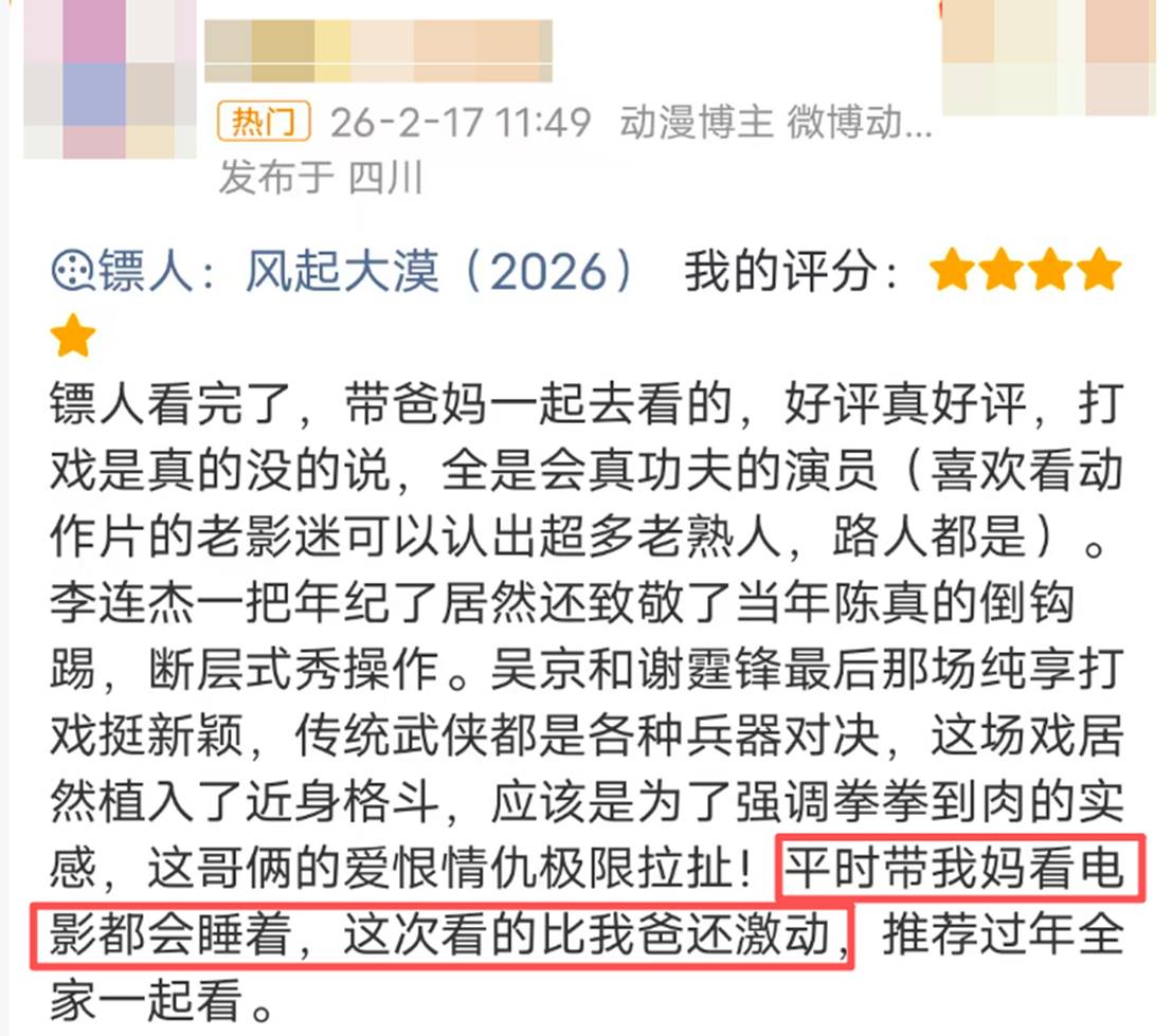 我爸平时进影院就犯困,这次全程睁大眼睛,散场还念叨:“这才是老辈人爱看的武侠,打得实在,人也演得实在”;我妈指着银幕认熟脸,吴京、谢霆锋、李连杰、惠英红、张译、张家辉,一个没落全叫得出;连坐不住的小朋友,都被大漠骑马、弯弓射箭的场面吸引,安安静静看到结尾。没有尴尬、没有冷场、没有中途离场,对全家观影来说,真的太难得。