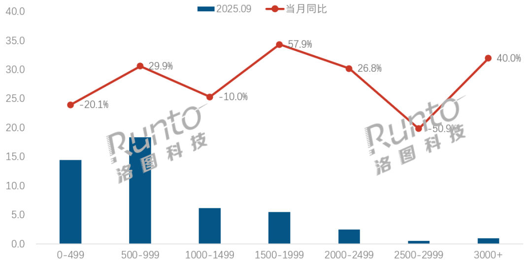 虽然2500-2999元价格区间的销量同比下跌50.9%,但占有的市场份额最小。