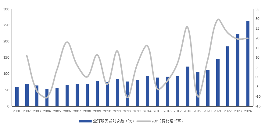 巨型星座建设推动发射需求扩张,全球航天发射次数快速增长,商业火箭成为发射主力。航天产业早期主要对接国家项目和特定行业需求,发射需求较为稳定。根据Jonathan’s space page的统计,全球航天发射次数从2001年的59次逐步增长至2020年的112次,CAGR为3.4%。2020年后巨型星座建设需求释放,卫星互联网带动全球航天发射增速换挡,全球航天发射次数由2020年的112次增加到2024年的263次,CAGR达23.8%。SpaceX作为全球卫星互联网建设龙头,其卫星发射数量从2019年的124颗增长至2024年的1992颗,占全球2024年卫星发射数量的70%。卫星互联网建设热潮下,低成本、高效率的商业火箭应运而生,成为全球发射主力。图表20 2001~2024年全球航天发射次数