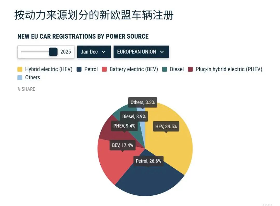 拿欧盟来说,2025年的新能源渗透率仅为26.8%(纯电17.4%+插混9.4%),乍一看属于电气化转型不积极的“差等生”。