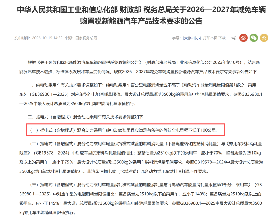 而当时间来到2026年,新能源汽车免购置税政策已经退出,变为减半征收。针对PHEV纯电续航里程的要求,也进一步增加到了100km以上(WLTC)。