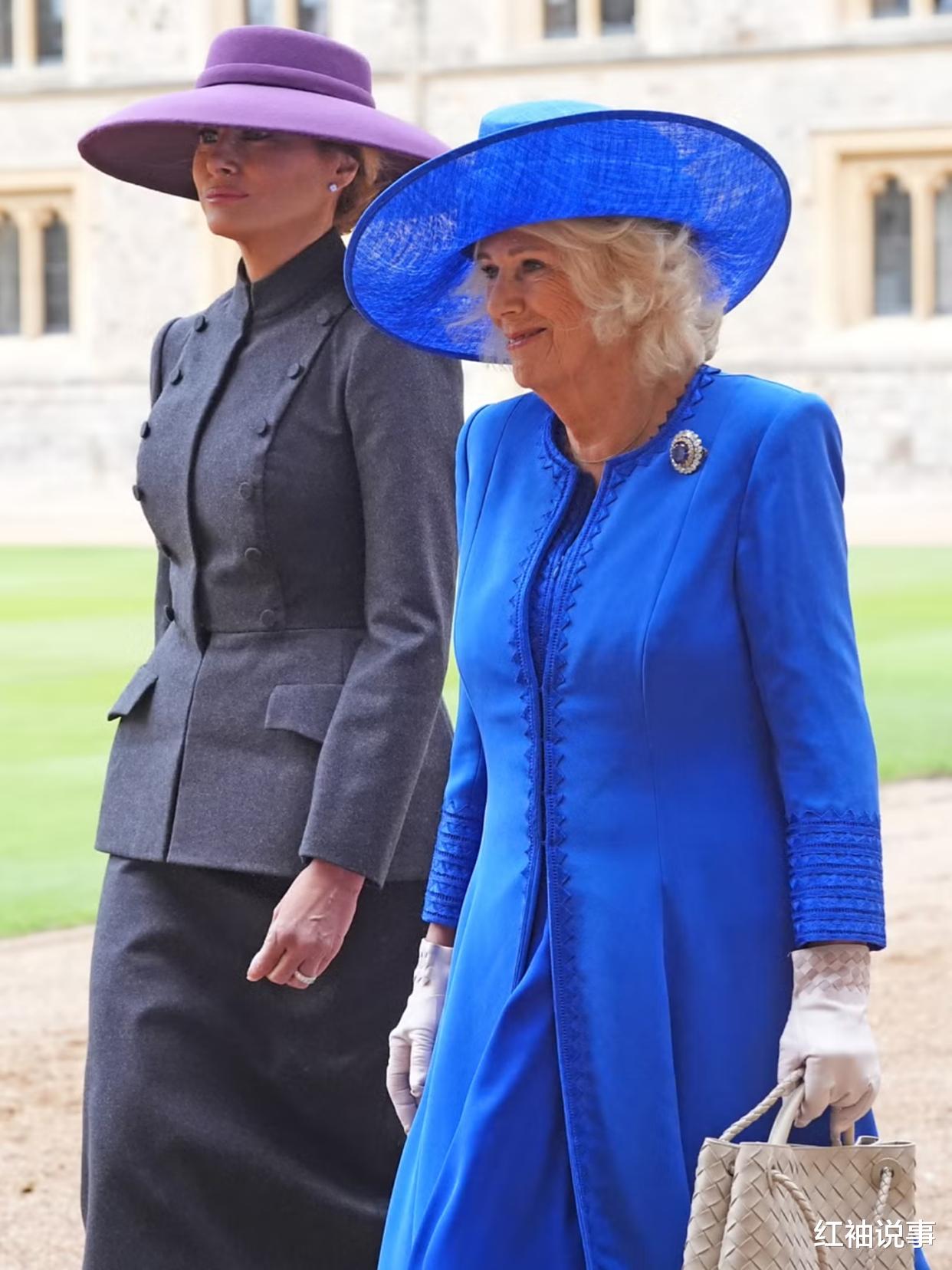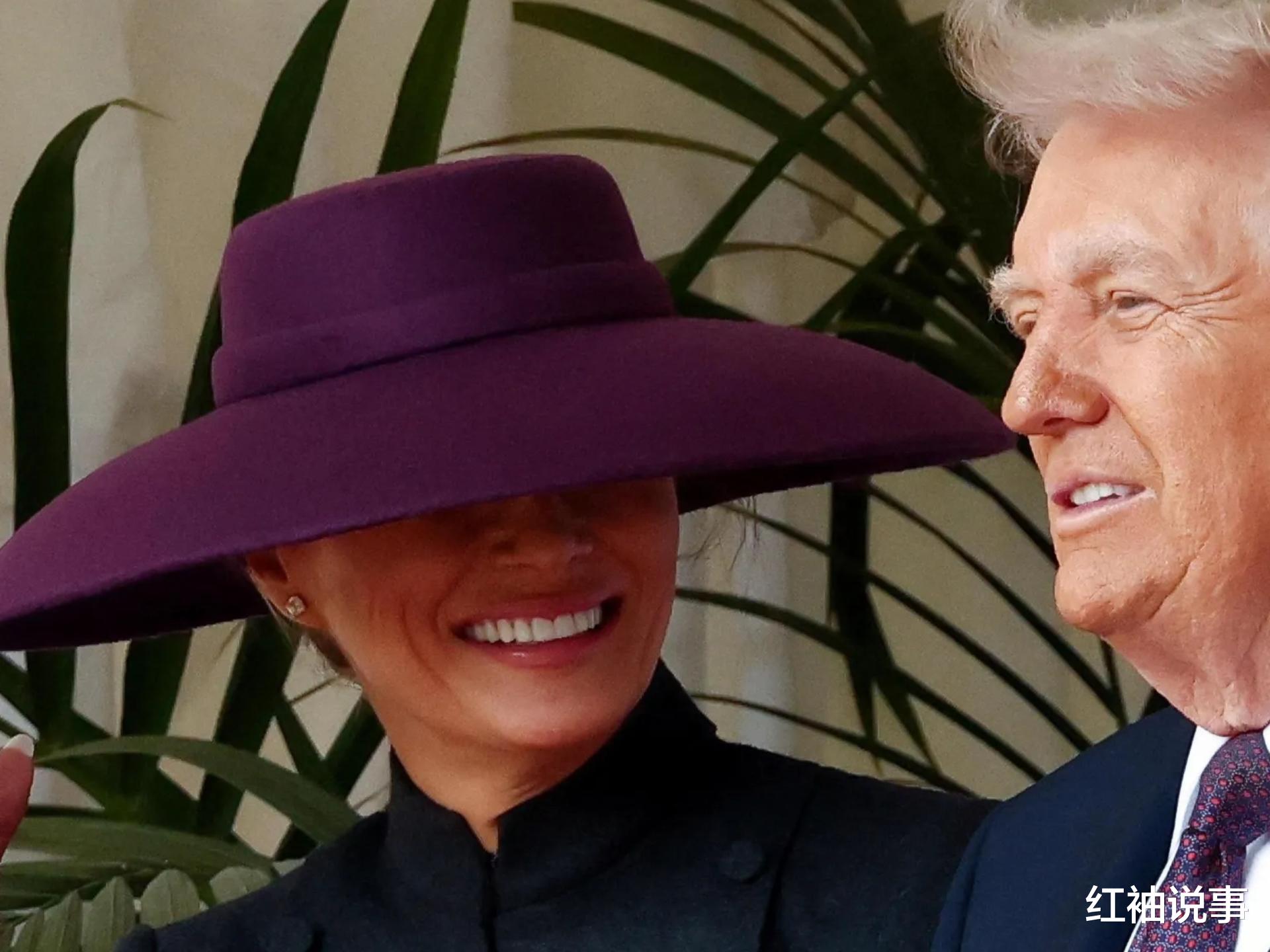访英首日,第一夫人便展现出强烈的戏剧性时尚风格。她抵达温莎城堡时,头戴一顶宽边紫色帽子,帽檐几乎遮住眼睛,搭配迪奥永恒经典的深灰色西装。迪奥作为梅拉尼娅钟爱的时装品牌,此次选择再次彰显其时尚品味。