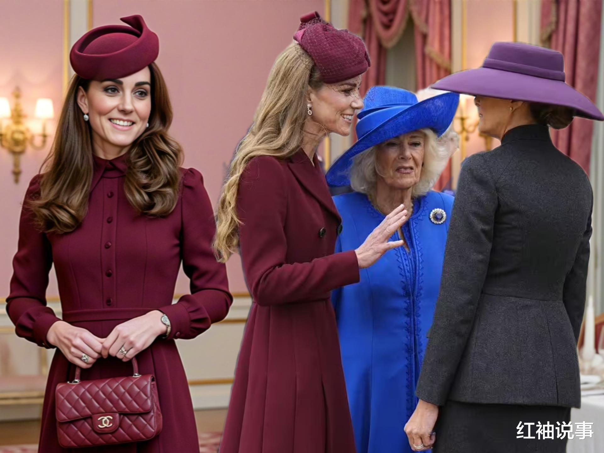 在欢迎仪式上,凯特王妃与王室其他成员一同亮相,瞬间成为全场焦点。她的丈夫威廉王子、国王查尔斯三世,以及卡米拉王后也一同出席,共同迎接贵宾。当日,凯特身着她经典的单色套装,此次选择的是酒红色系,尽显优雅气质。