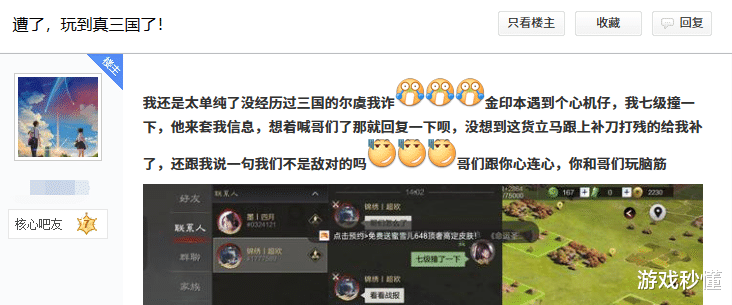 甚至还有玩家在游戏中还真经历了一番三国的尔虞我诈,遇到了一个心机仔,玩出了真三国的感觉!