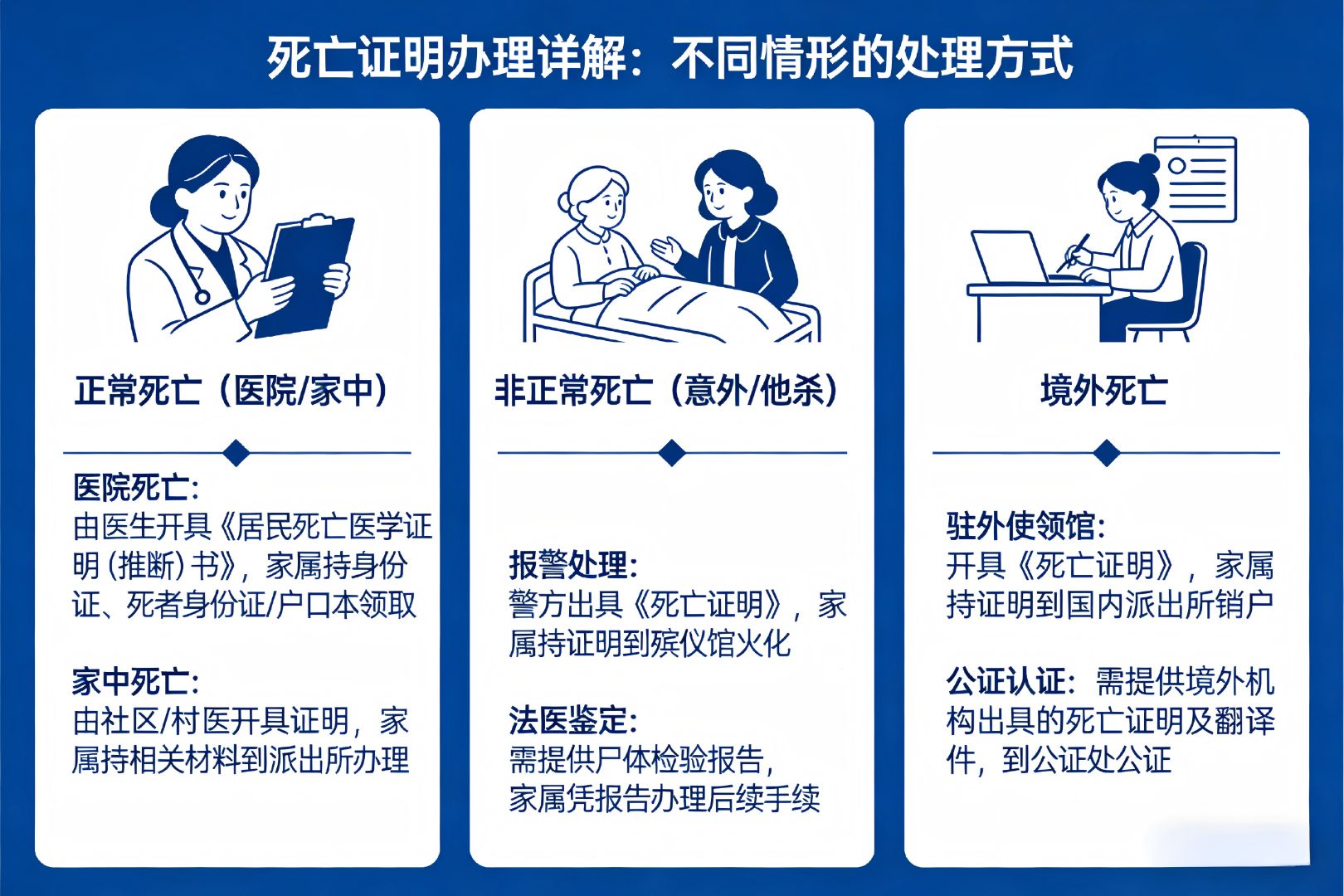 注意事项:如在家中去世且死因不明,应及时报警由法医进行检查