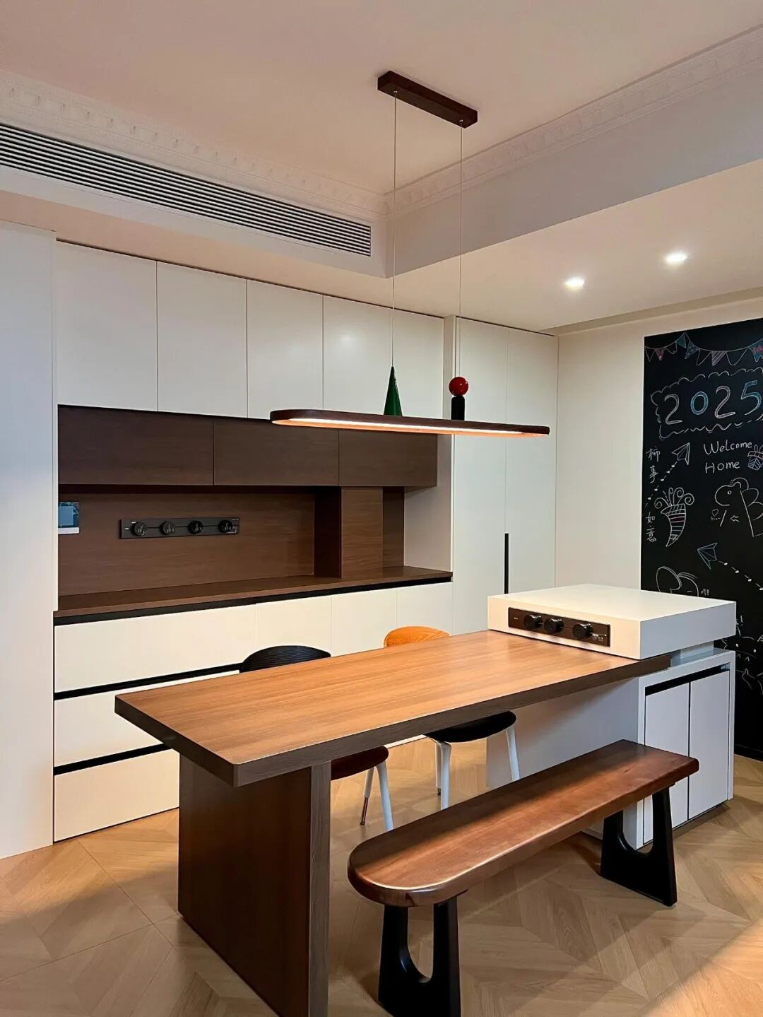 岛台餐桌可以做伸缩设计,平时人少的时候,缩短尺寸,占不了多少地方。家里来客人,把桌子一拉,立马能多坐好几个人,不用尴尬地挤着吃饭。