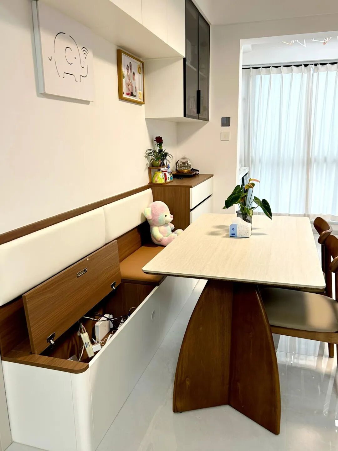 这一点真的太实用了,卡座下方可以做成收纳柜,平时家里的餐具、杂物都能塞进去,收放都特别省心,餐厅再也不会乱糟糟的了。