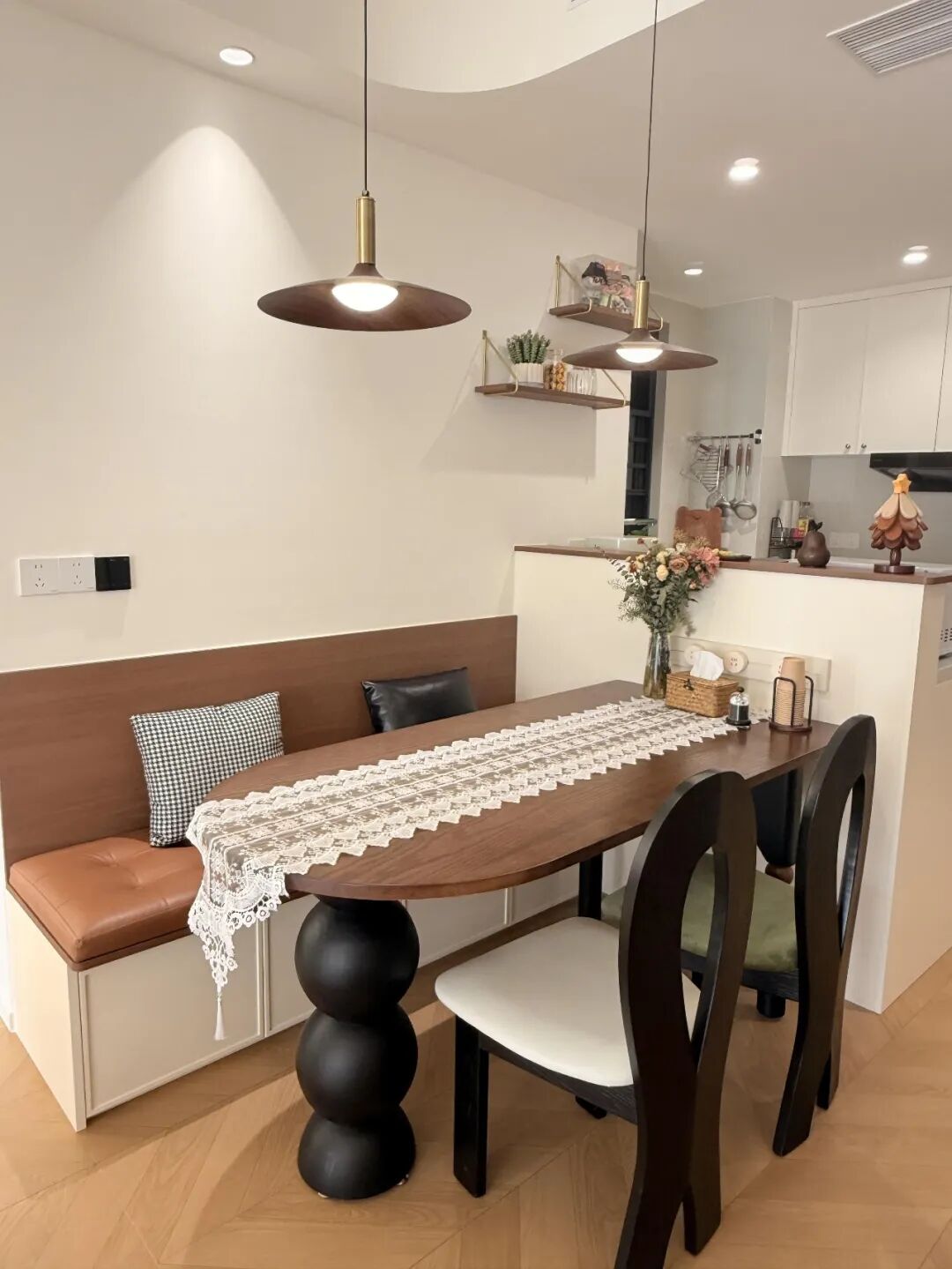 卡座是靠着墙设计的,可以根据自家尺寸定制,把空间利用得明明白白,中间配一张小方桌或者小圆桌,一家三四口人吃饭,完全够用,而且不占过道空间,餐厅能宽敞不少。