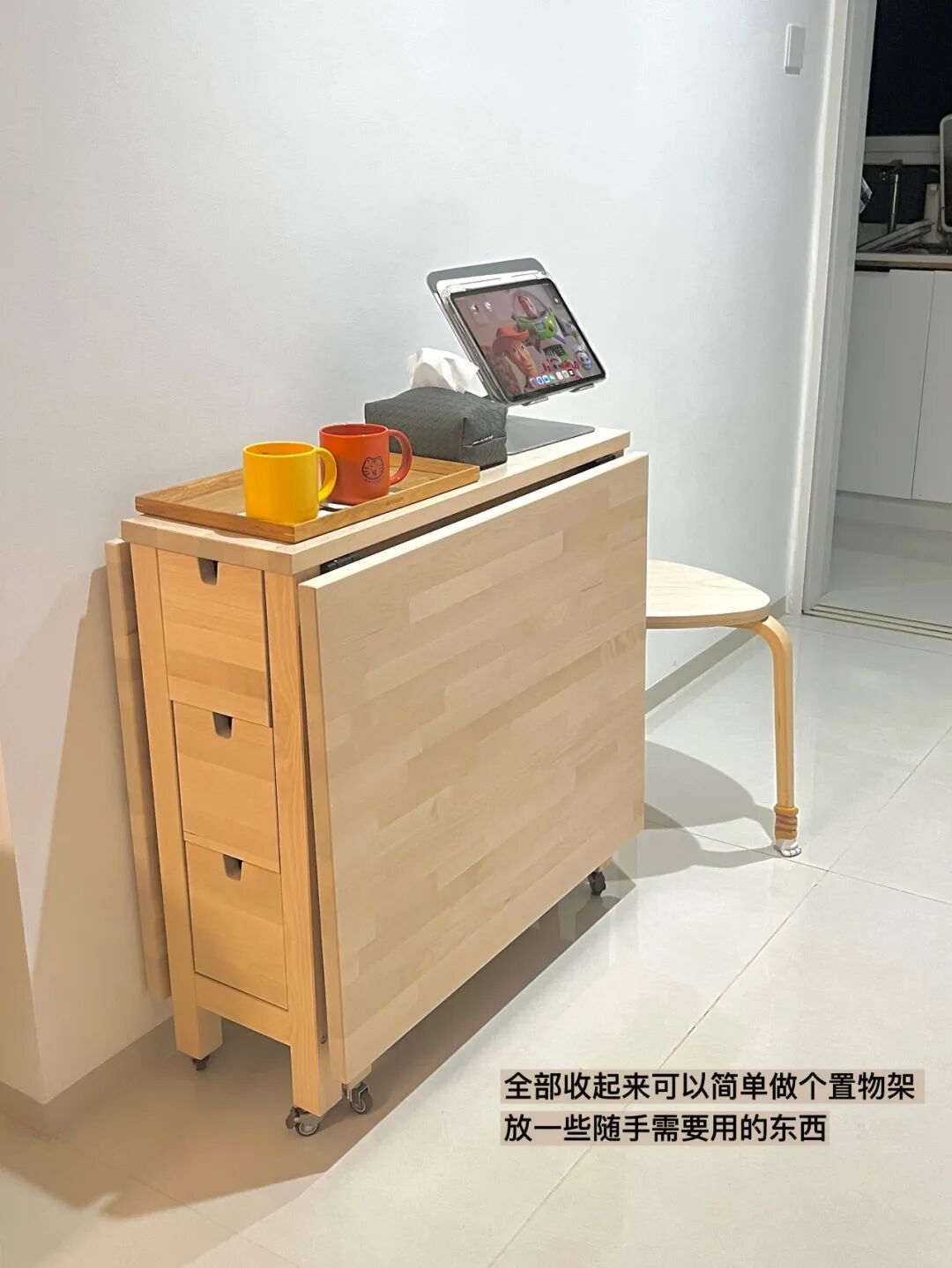 折叠餐桌还能一桌多用,合起来的时候,可以当茶几,放零食、杂志、遥控器。展开一半,能当孩子的学习桌,孩子写作业,大人在旁边看书、办公。