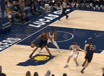 接球后立即压低重心启动右路突破,没能摆脱防守人,于是行进间使用半转身误导调度防守人重心后立即衔接前转身后仰跳投。