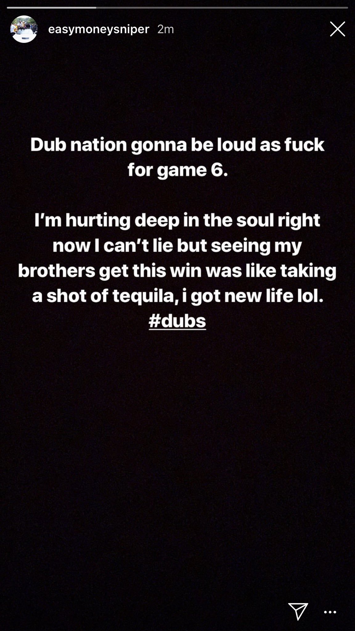 勇士做客多伦多以106-105险胜猛龙扳回一局,但是仍然2-3落后。复出的杜兰特出战12分钟得到11分2篮板之后便再度受伤离场。赛后,杜兰特在ins上表示:“我不想去说谎,但是我现在心里真的受伤了,好在我的队友们也终于拿下了比赛,我就好像跟干了一杯龙舌兰一样,瞬间得到了新生。”其实,有不少媒体和球员都在为杜兰特祈祷没有大碍,但也有人为:他勇士最后一次比赛,已经结束了。