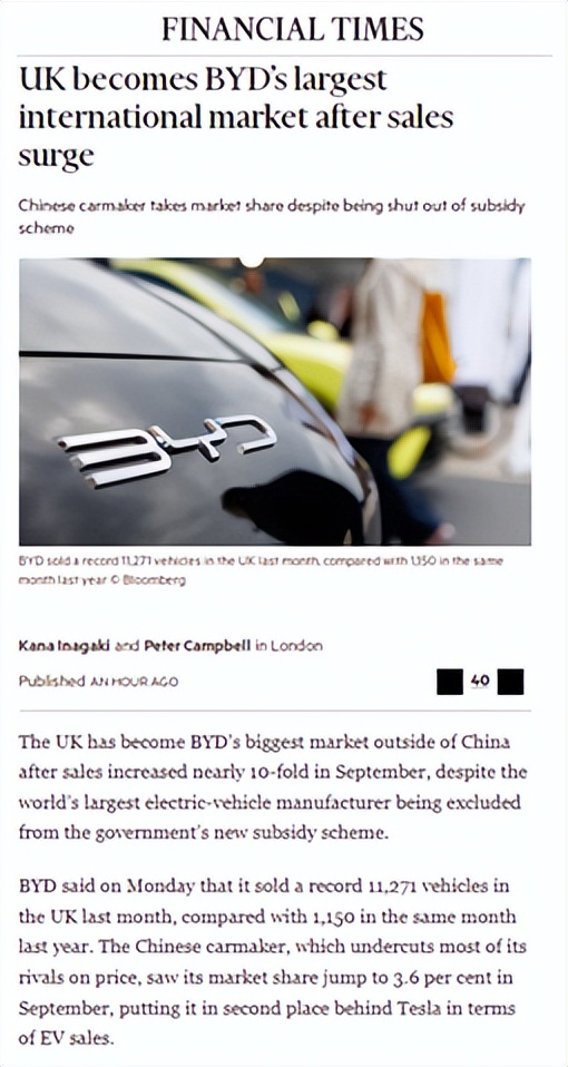比亚迪在英国市场的高速增长,也吸引了英国主流媒体的高度关注。英国广播公司(BBC)报道“中国电动汽车巨头比亚迪9月英国销量创下新高”;《泰晤士报》则以“中国新晋品牌比亚迪超越英国老牌汽车品牌”为题,指出“两年前英国几乎没人听说过比亚迪”;《金融时报》更进一步强调“英国成为比亚迪最大的国际市场”。