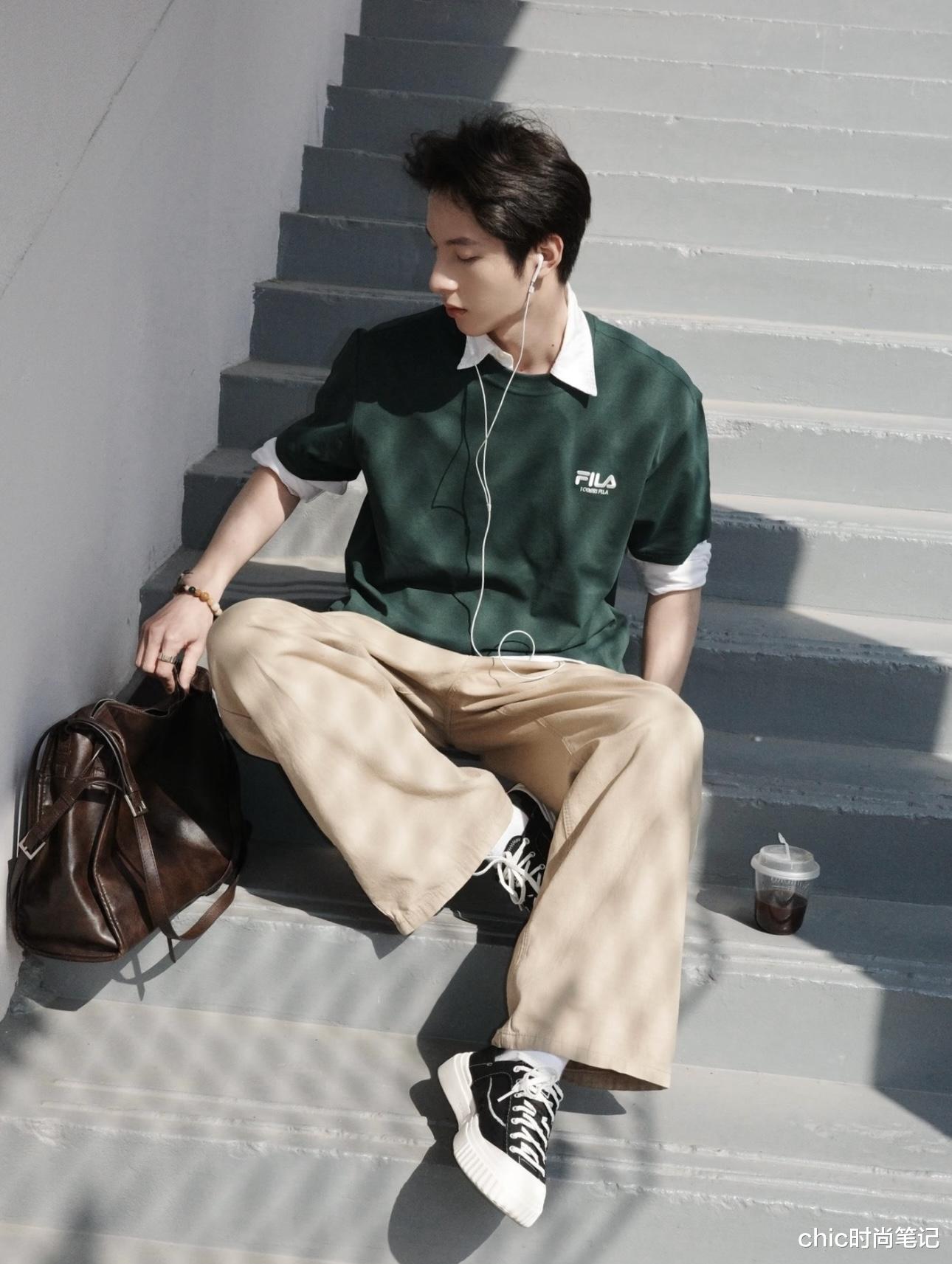 亮点:绿色元素自带清新与清爽,搭配黄色帆布包、黄色跑鞋,整套穿搭色彩对比度明显。