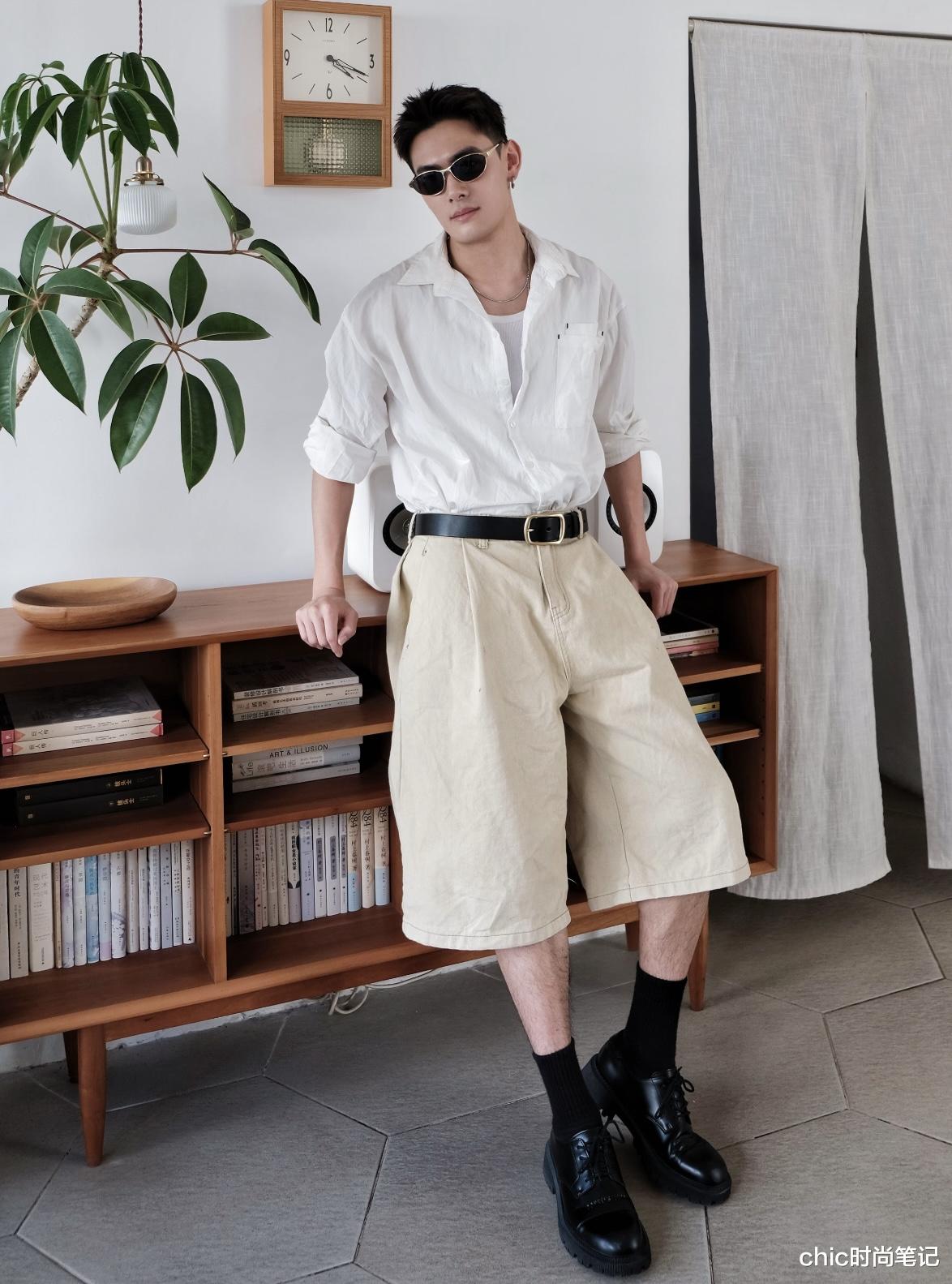 亮点:搭配五分裤用来“缓解”正装带来的沉闷感,选择黑皮鞋让整套穿搭个性又诙谐。