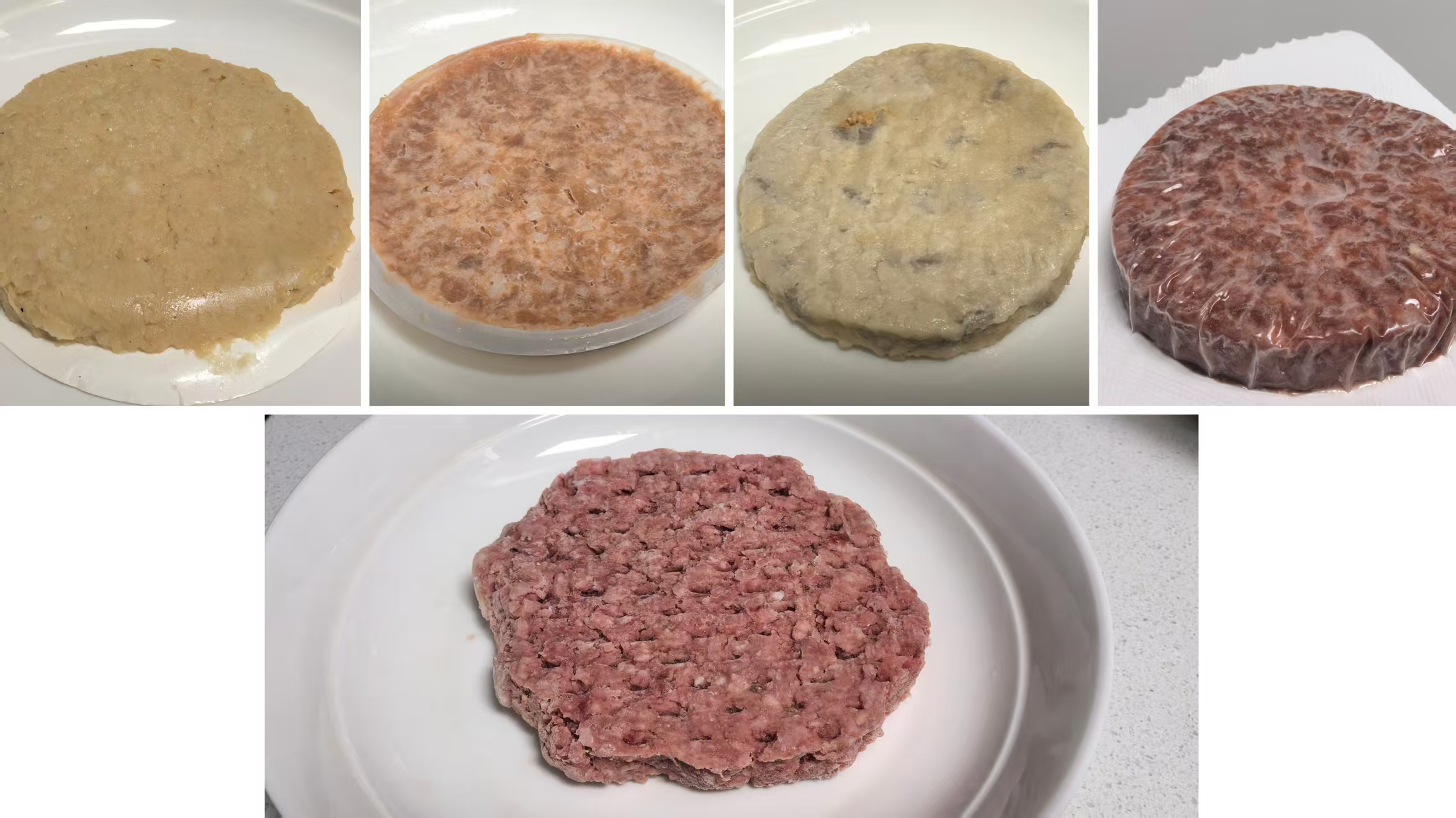 产品拆开第一层包装后的形态。上方从左至右为别样肉客、众素、爱之素、庖丁造肉植物肉,下方为真肉肉饼。 新京报记者 王思炀 摄