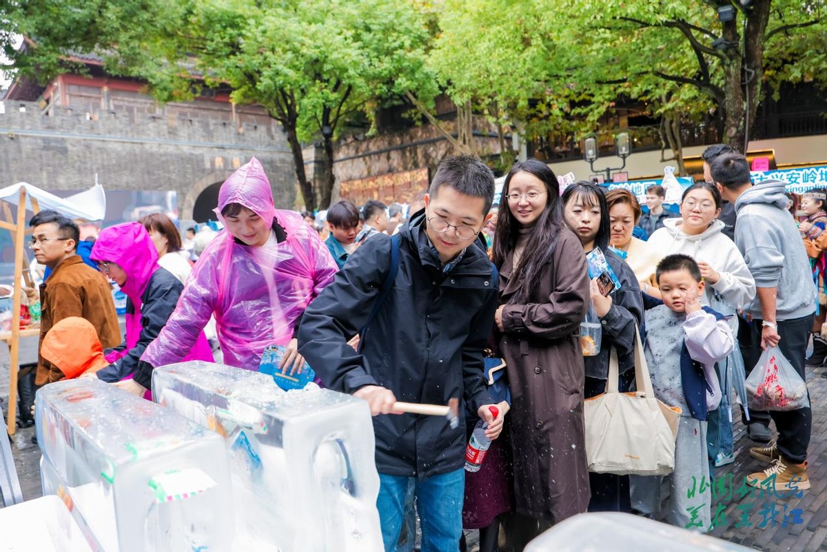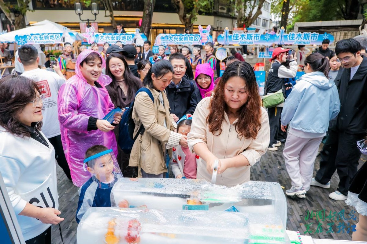 本次市集最大的亮点在于其巧妙的互动设计。工作人员向游客派发精美的活动邀请卡,持卡者可以到各城市展位集齐所有印章后,即可获得参与“砸冰取宝”终极挑战的资格。