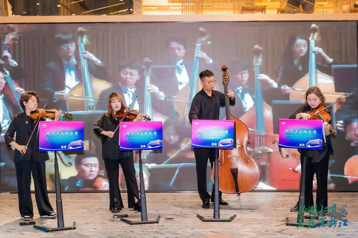 首轮快闪在哈尔滨交响乐团小提琴手的独奏中拉开序幕。随着中提琴手的互动,一曲《乌苏里船歌》悠然响起。紧接着,第二位小提琴手与贝斯手陆续加入,来自佳木斯的歌手放开歌喉唱起了“乌苏里江来长又长……”。一曲终了,在观众热情的呼喊与期待的目光中,音乐声再次响起,舞蹈演员手持黑龙江文旅口号手举牌翩然起舞,在“冰城左右哥”的带动下,《我和我的祖国》的旋律瞬间点燃了全场的爱国热情,现场的杭州观众、来自天南地北的游客情不自禁地挥舞着手臂加入合唱,南北文化的深情交融与家国情怀的澎湃激情在街区久久回荡。